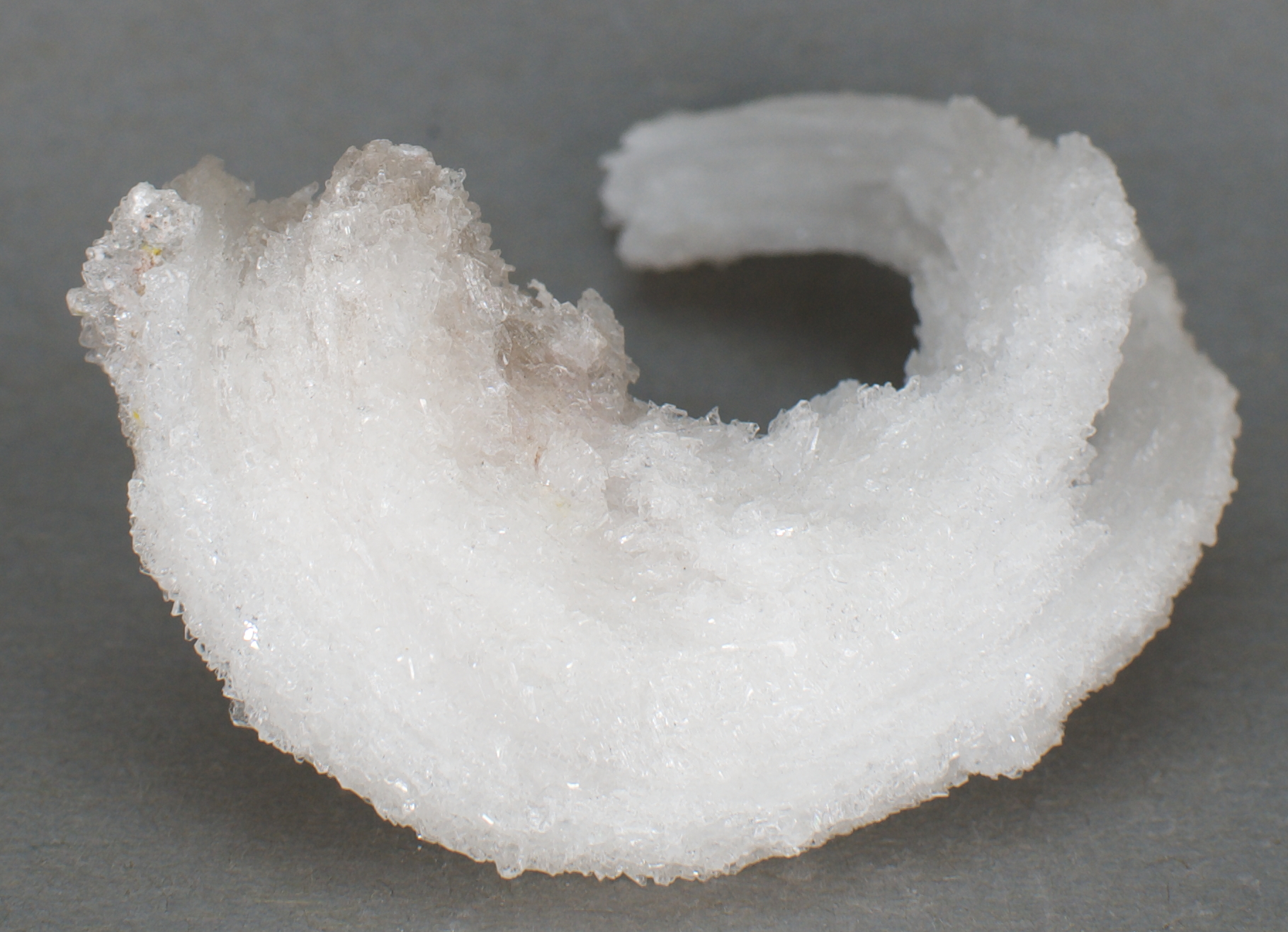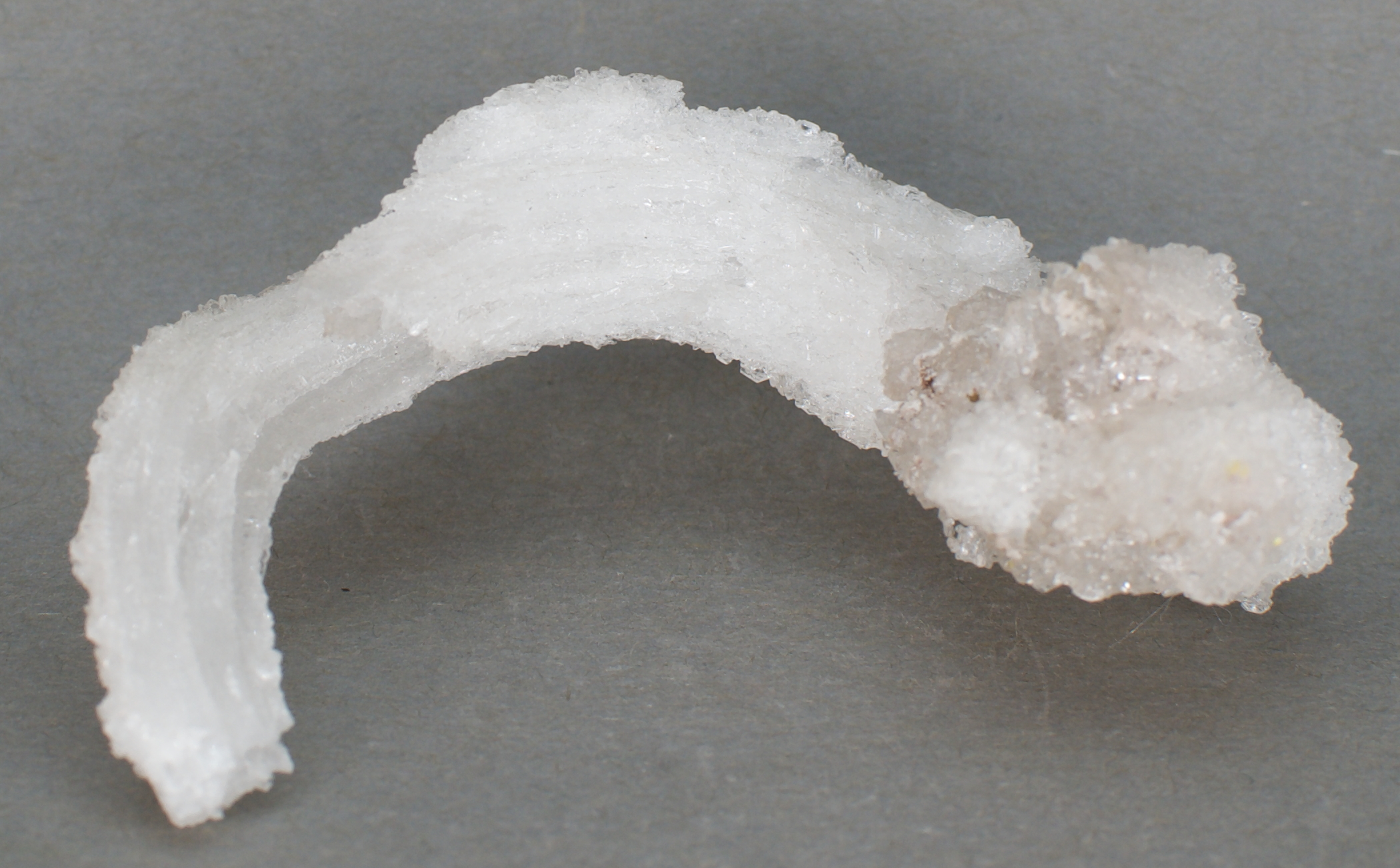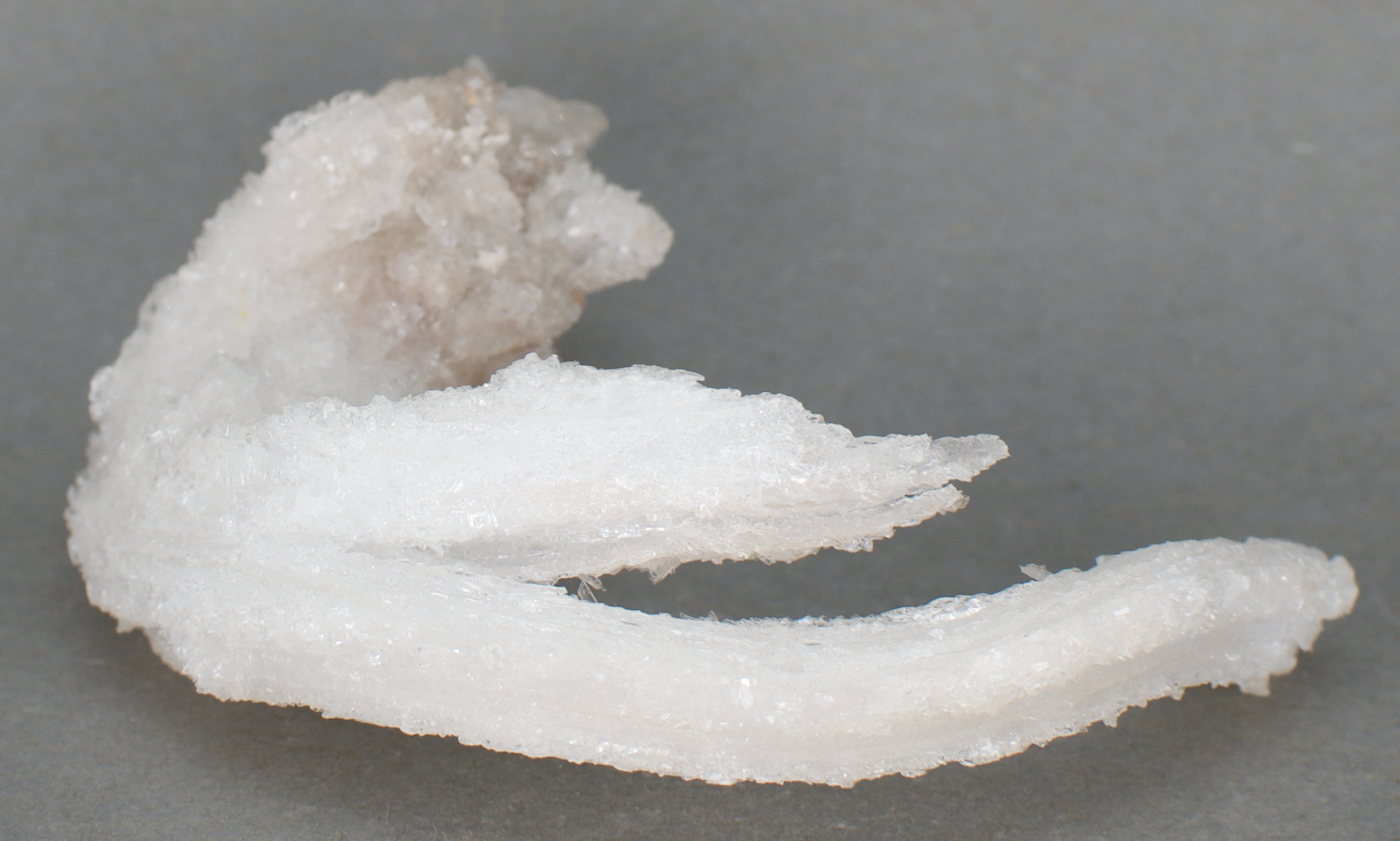 | 00670: Gypsum variety Ramshorn - $30 Southwest Mine, Hendricks Gulch, Bisbee, Cochise County, Arizona Small cabinet - 8.1 x 5.6 x 3.8 cm 44 grams Specimen status: Available Send an email with specimen number to order A curved (variety ramshorn),