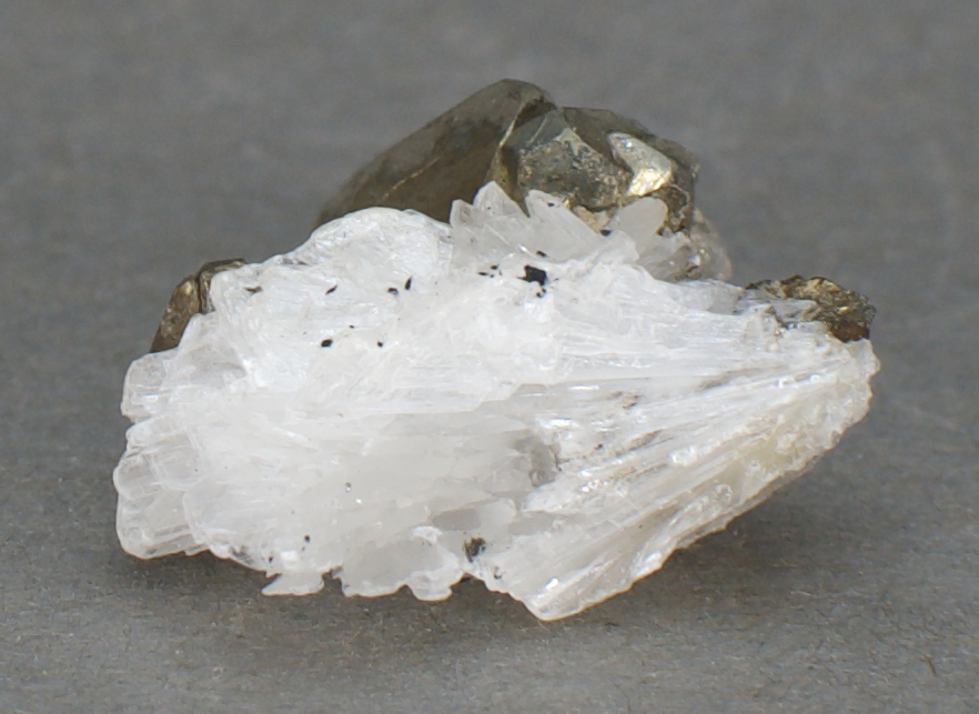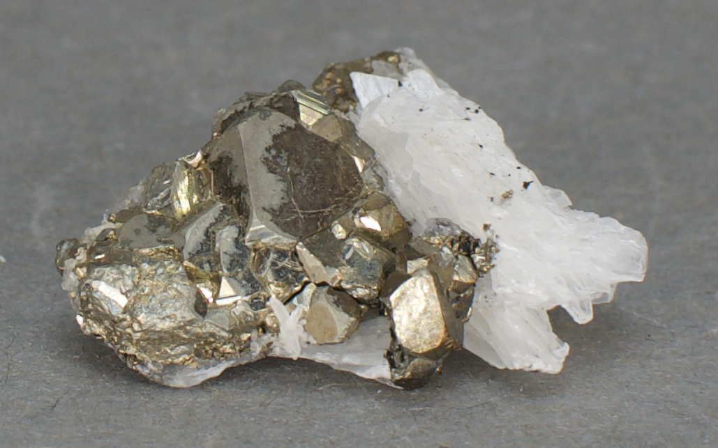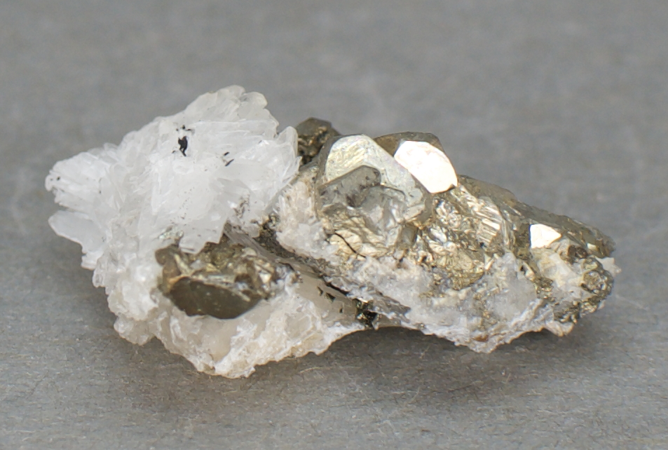 | 02624: Pyrite and Gypsum - $8 Butte Mining District, Silver Bow County, Montana Thumbnail - 2.6 x 2.3 x 1.1 cm 6.4 grams Specimen status: Available Send an email with specimen number to order A cluster of bright pyrite with