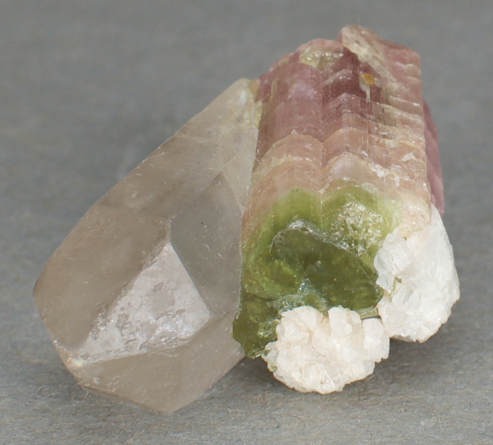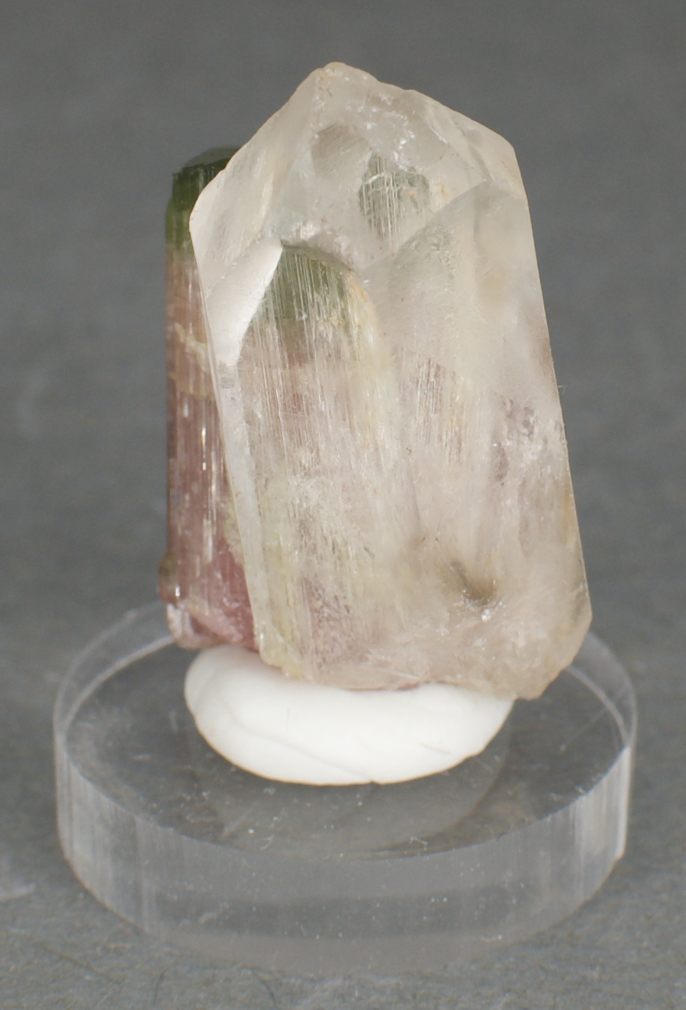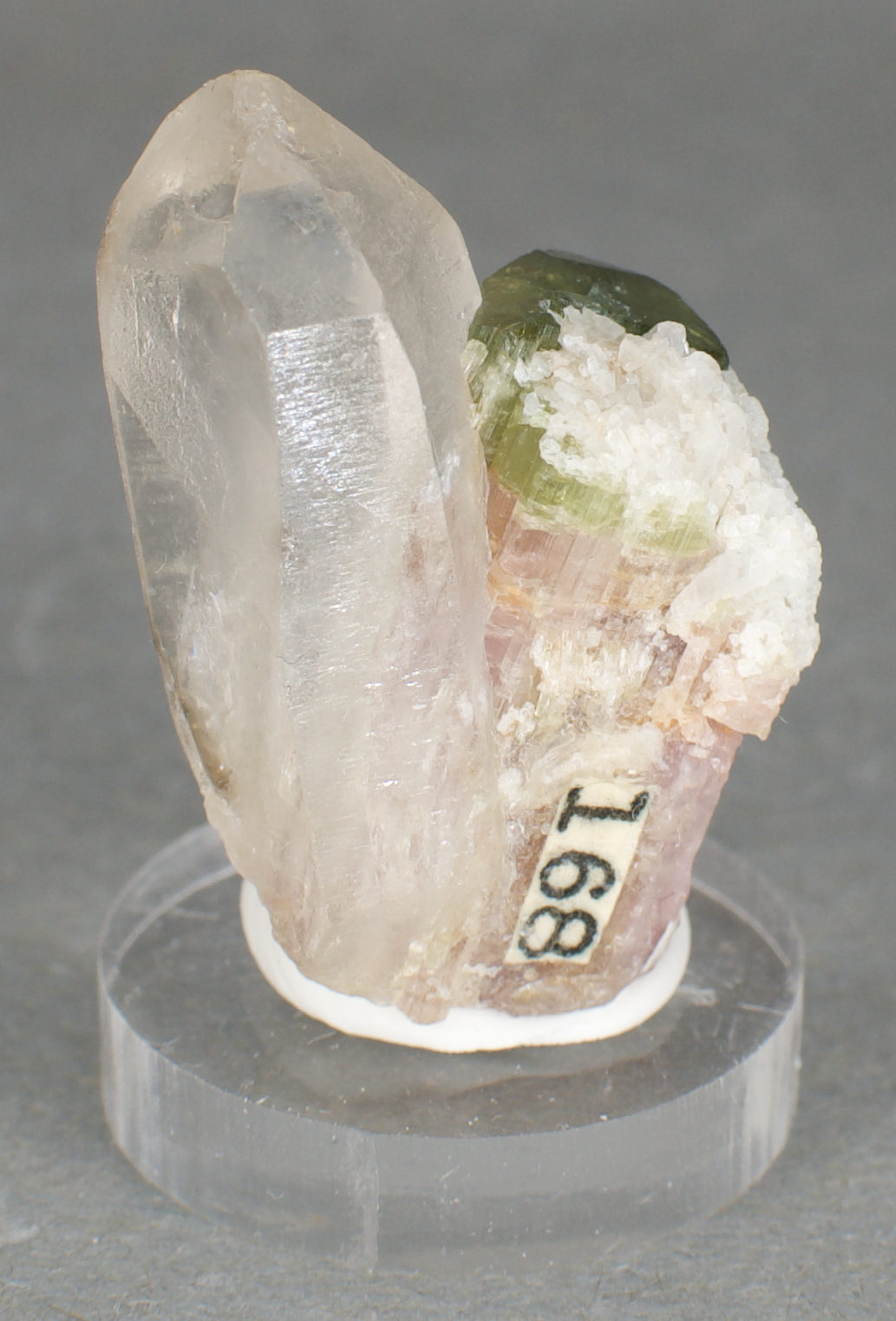 | 04587: Tourmaline and Quartz - $40 Tourmaline Queen Mountain, Pala, Pala Mining District, San Diego County, California Thumbnail - 2.6 x 2.3 x 1.5 cm 16 grams Ex Dave Crawford and William Sanborn Specimen status: Reserved Send an email with specimen number to order The translucent tourmaline crystal is