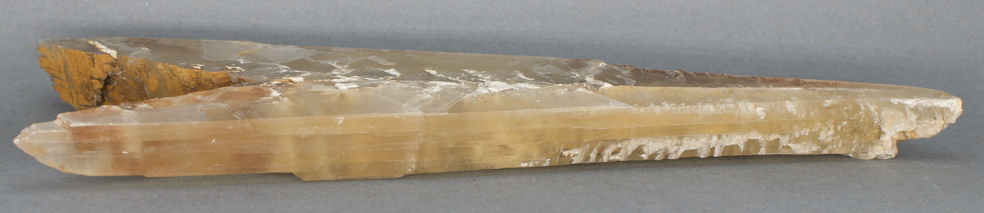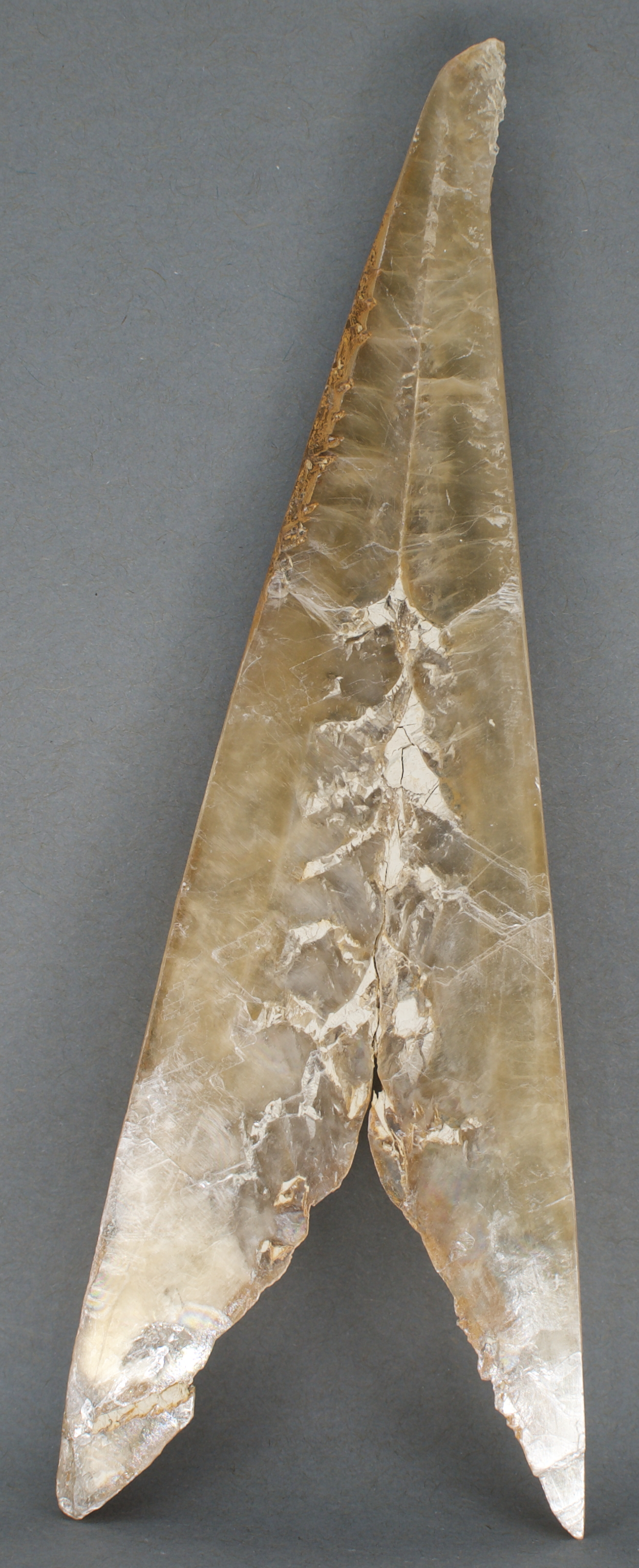 | 13599: Gypsum (twinned) - $40 Montmartre, Paris, Ile-de-France, France Large cabinet - 20 x 6.8 x 1.6 cm 178 grams Fluorescent (LW) Specimen status: Reserved Send an email with specimen number to order A large twinned gypsum crystal having