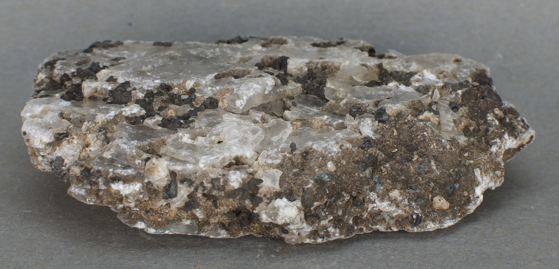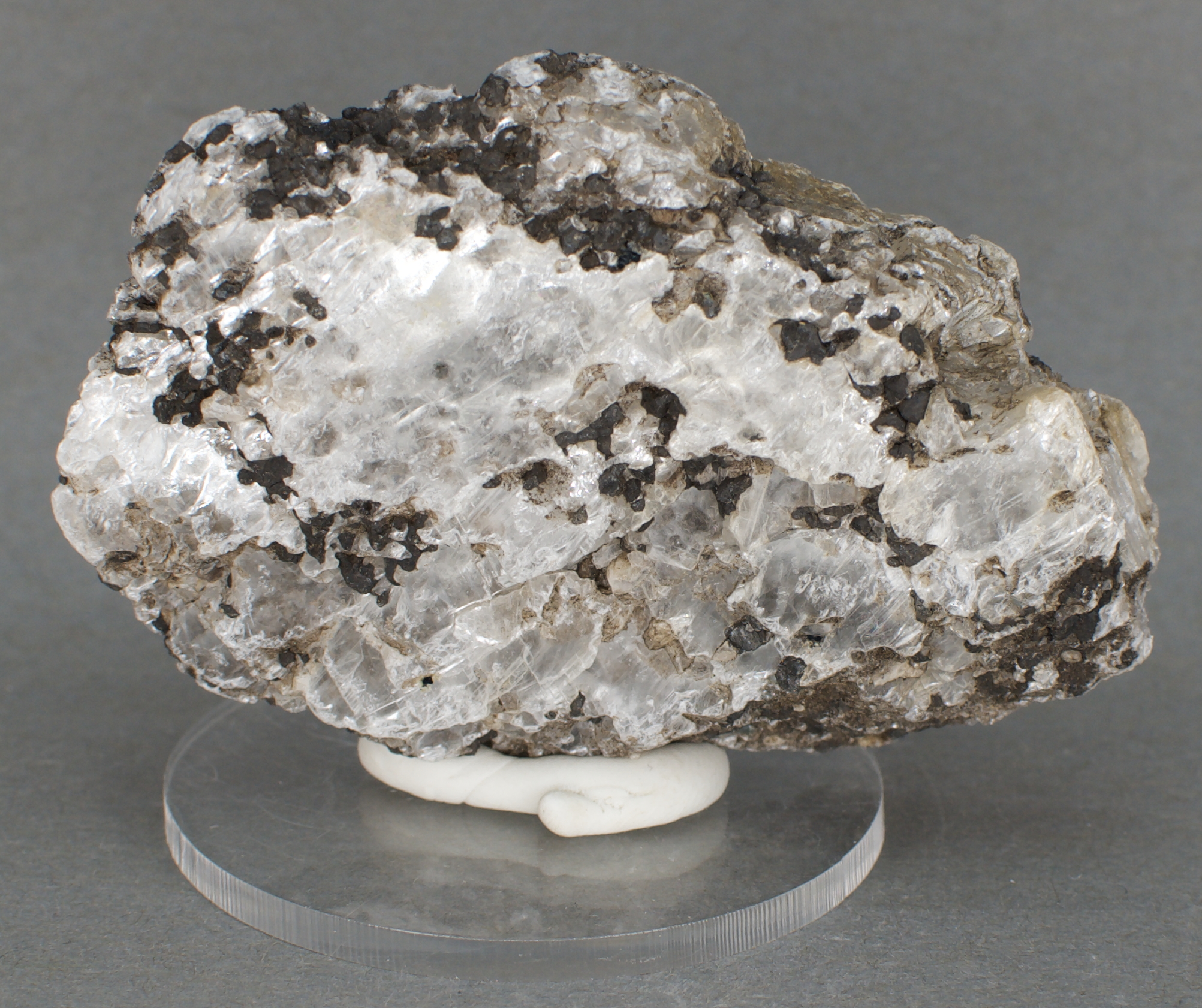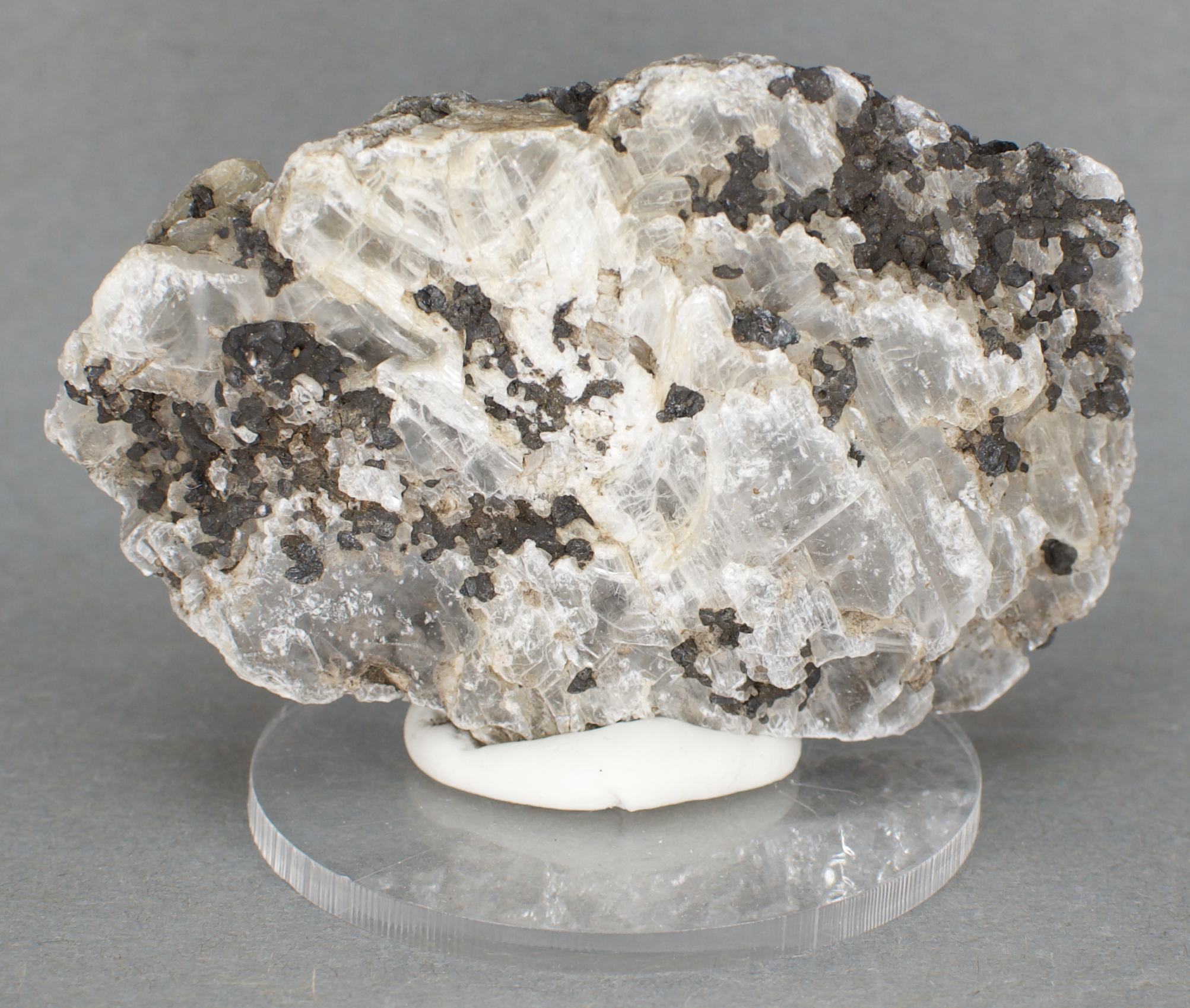 Franklinite and Calcite - $20 Mud Zone, Sterling Mine, Sterling Hill, Ogdensburg, Franklin Mining District, Sussex County, New Jersey Small cabinet - 7.3 x 5.1 x 1.8 cm 77 grams Fluorescent (SW) Ex Franklin Mineral Museum Specimen status: Available Send an email with specimen number to order A cleaved gypsum matrix, opaque to