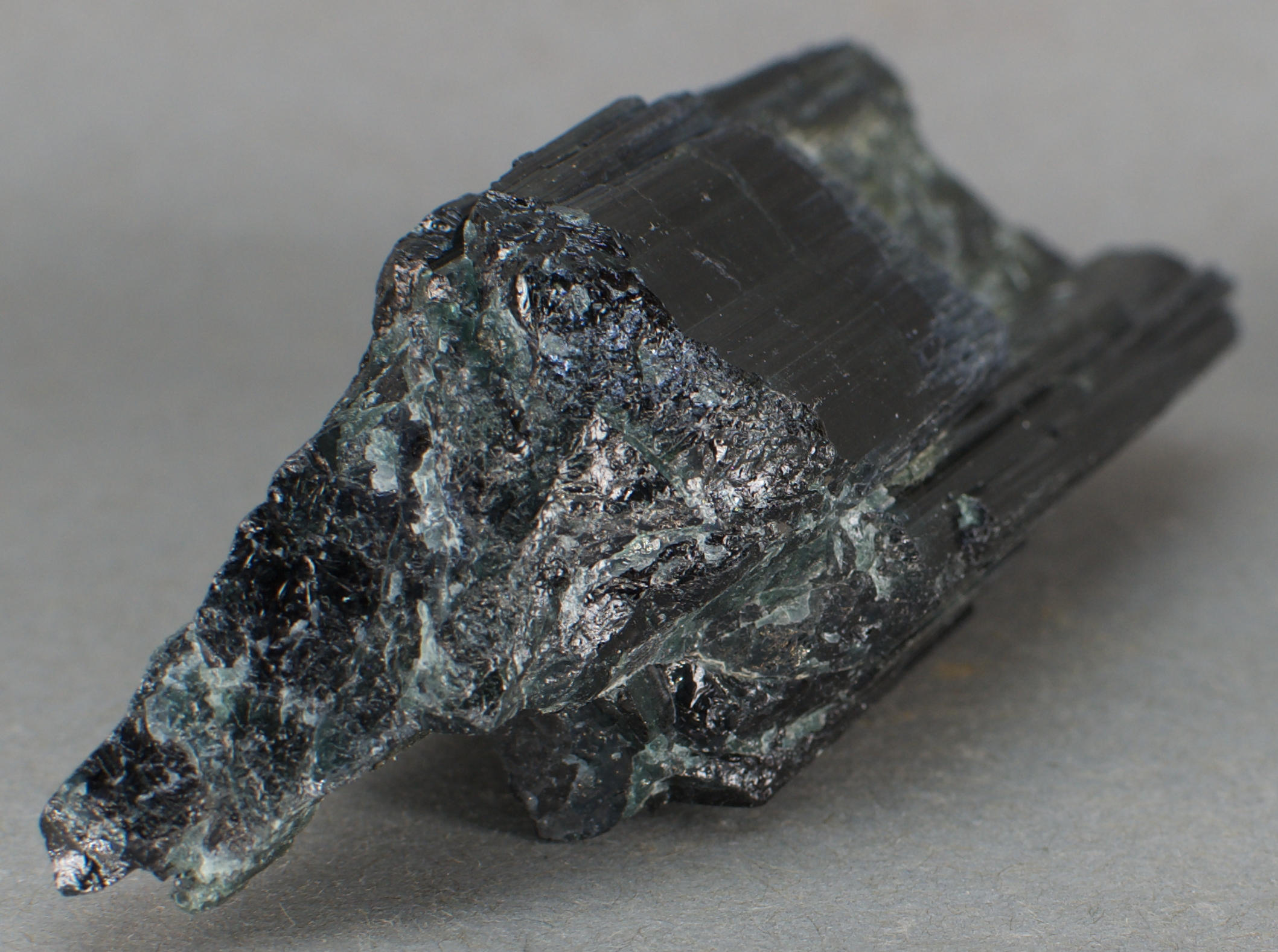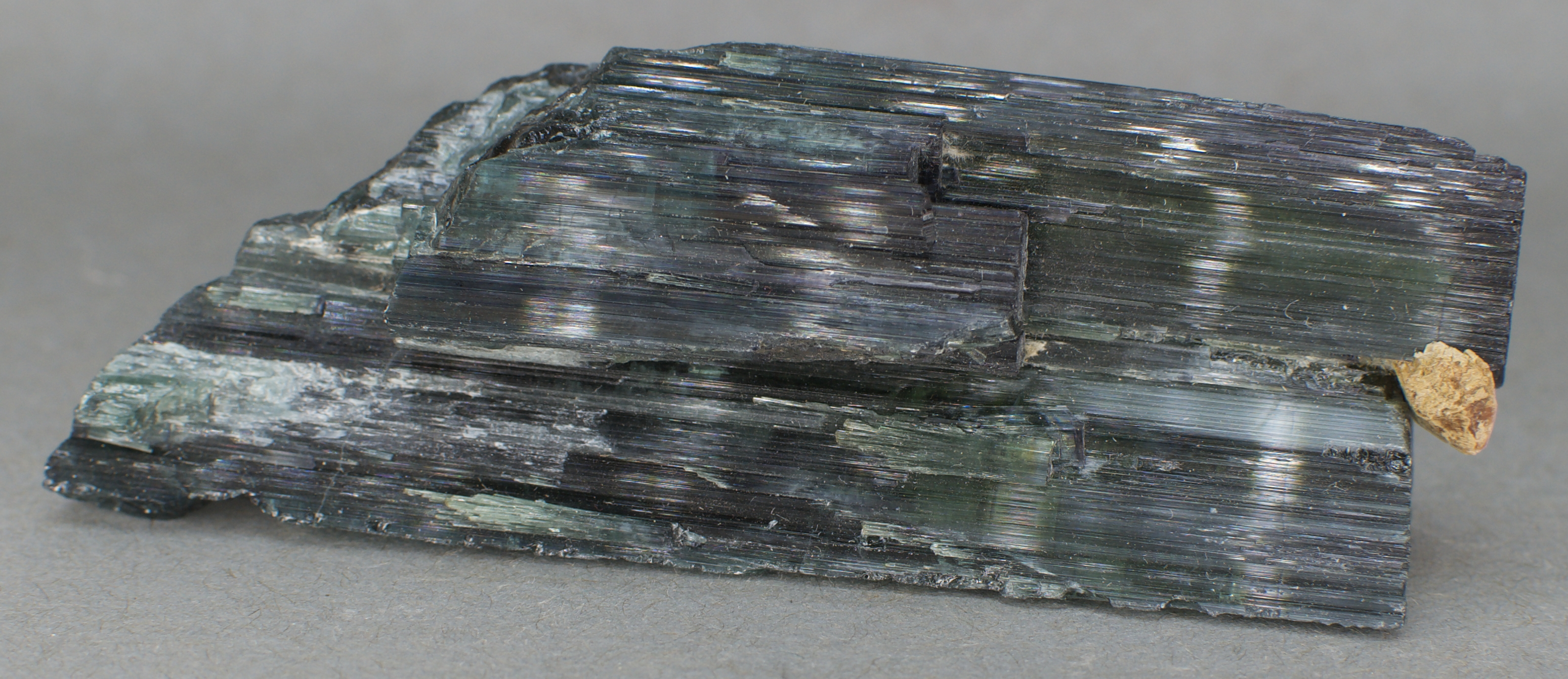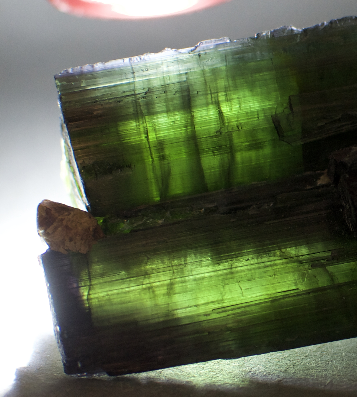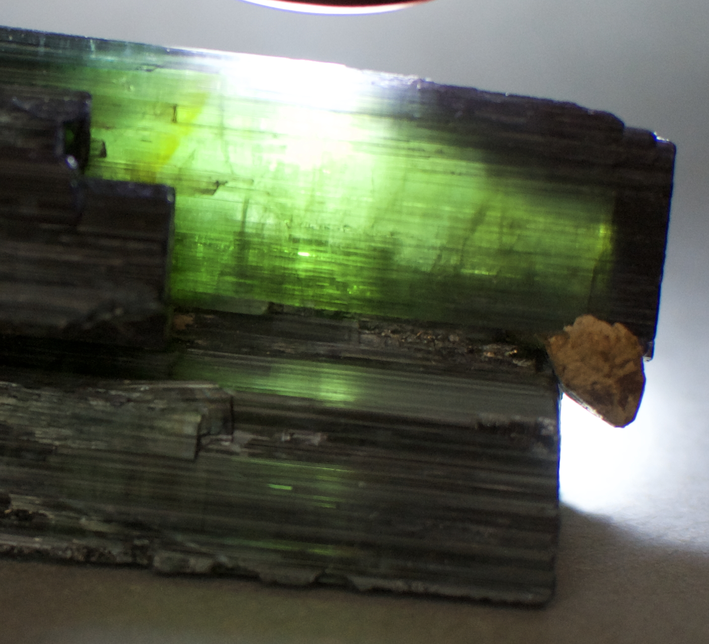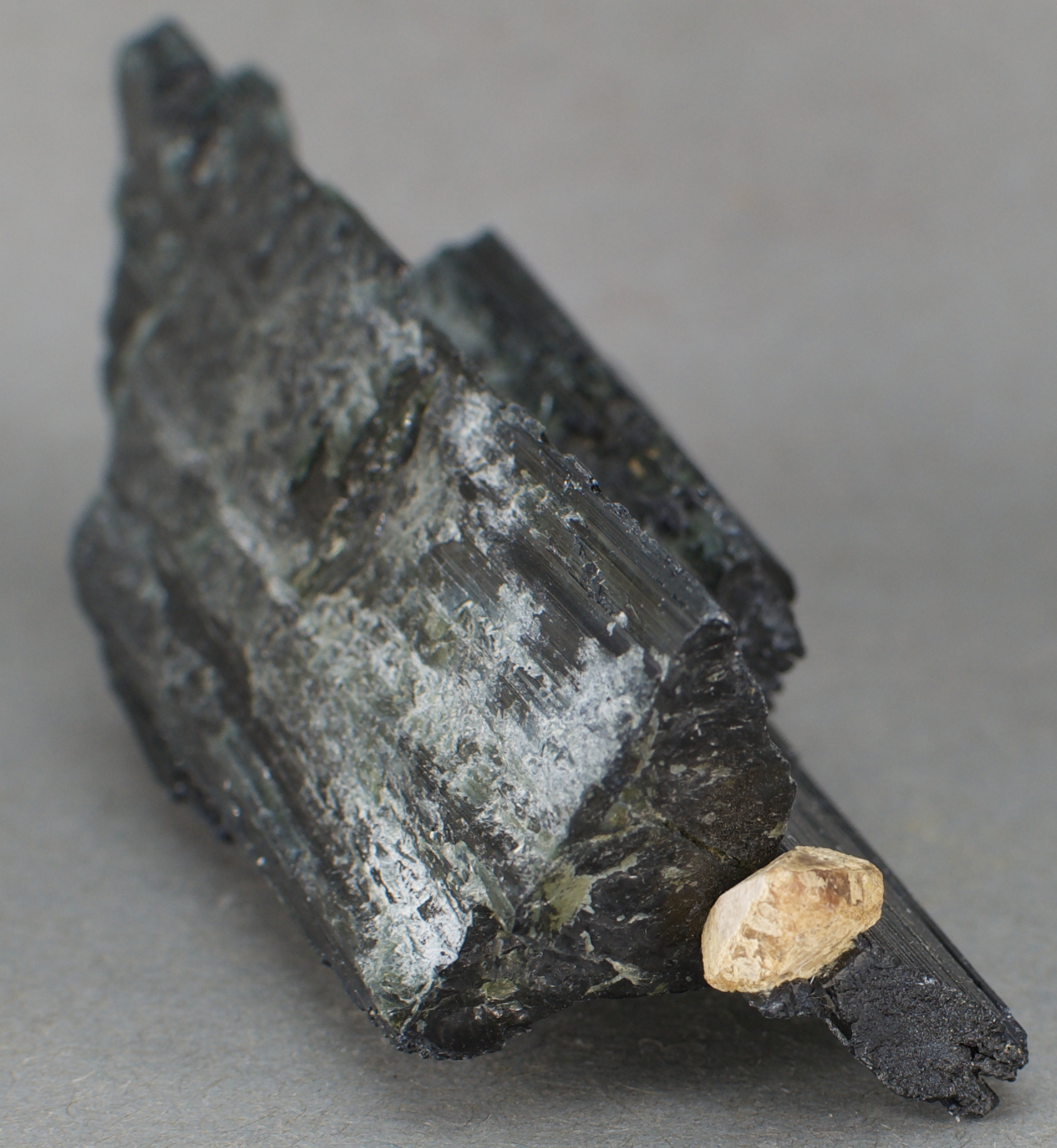 | 29072: Microlite and Tourmaline - $100 Virgem da Lapa, Minas Gerais, Brazil Cabinet - 9.8 x 3.2 x 3.2 cm 132 grams Specimen status: Available Send an email with specimen number to order A 1.0 cm, brown microlite crystal sits