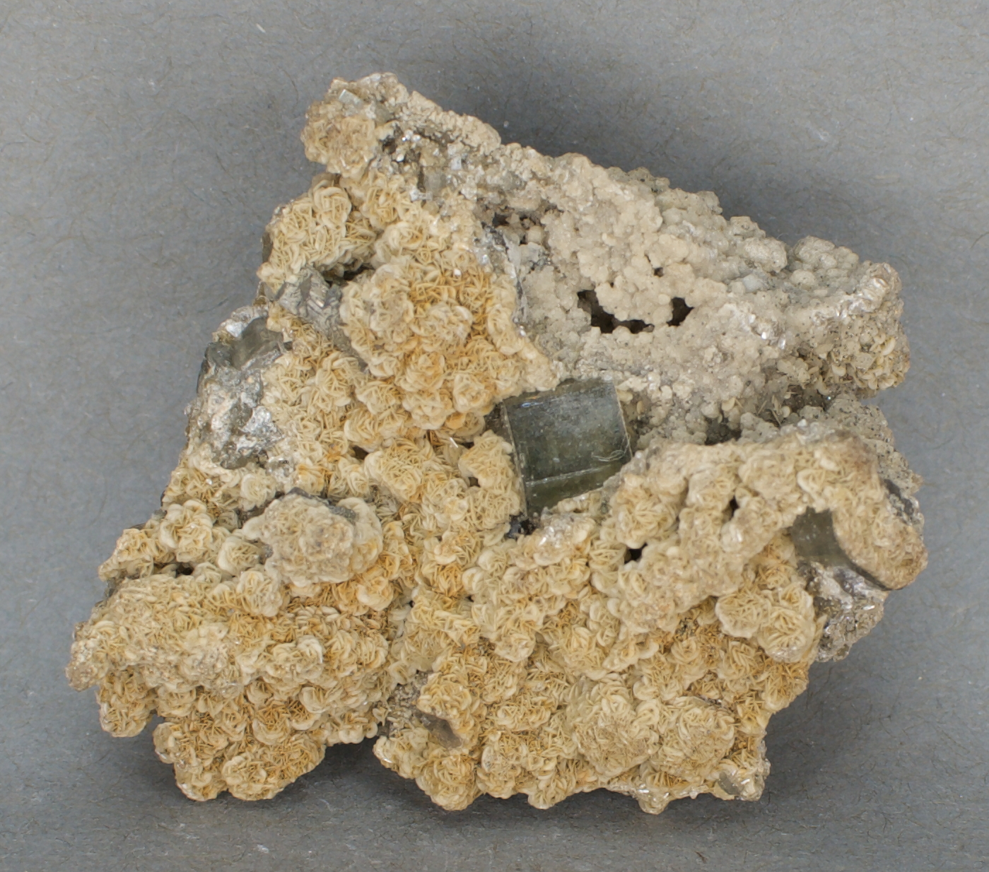 Calcite, Quartz and Muscovite - $16 Panasqueira Mines, Portugal Miniature - 5.9 x 5.3 x 2.6 cm 47 grams Specimen status: Available Send an email with specimen number to order A muscovite matrix hosts a 7 mm,
