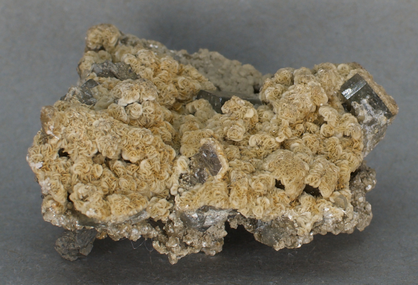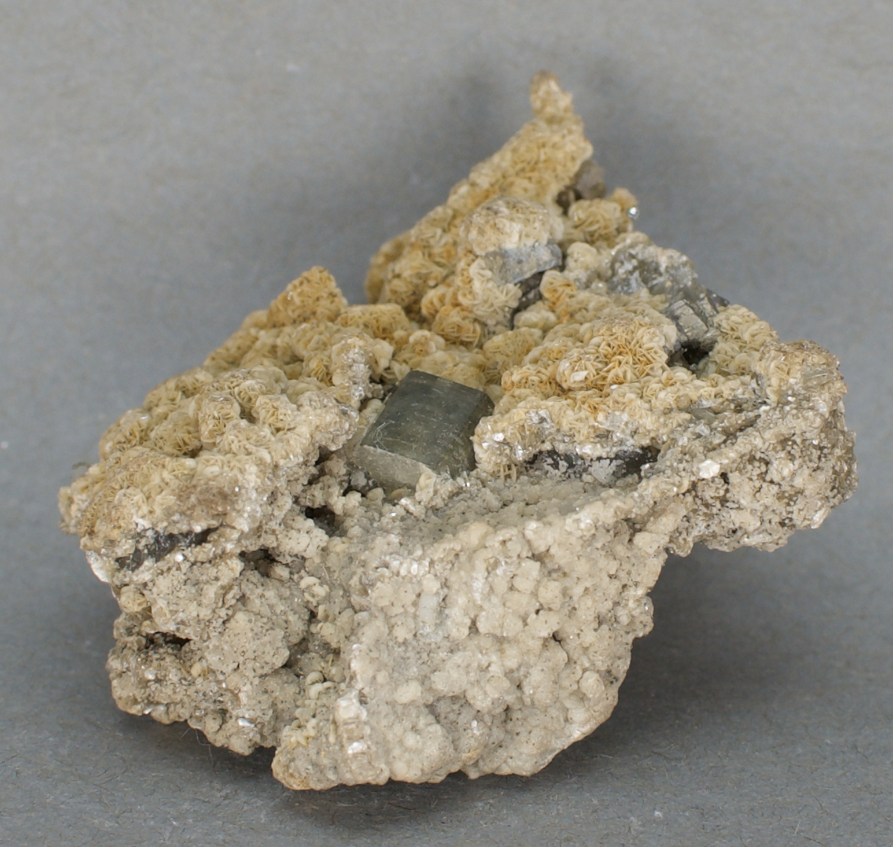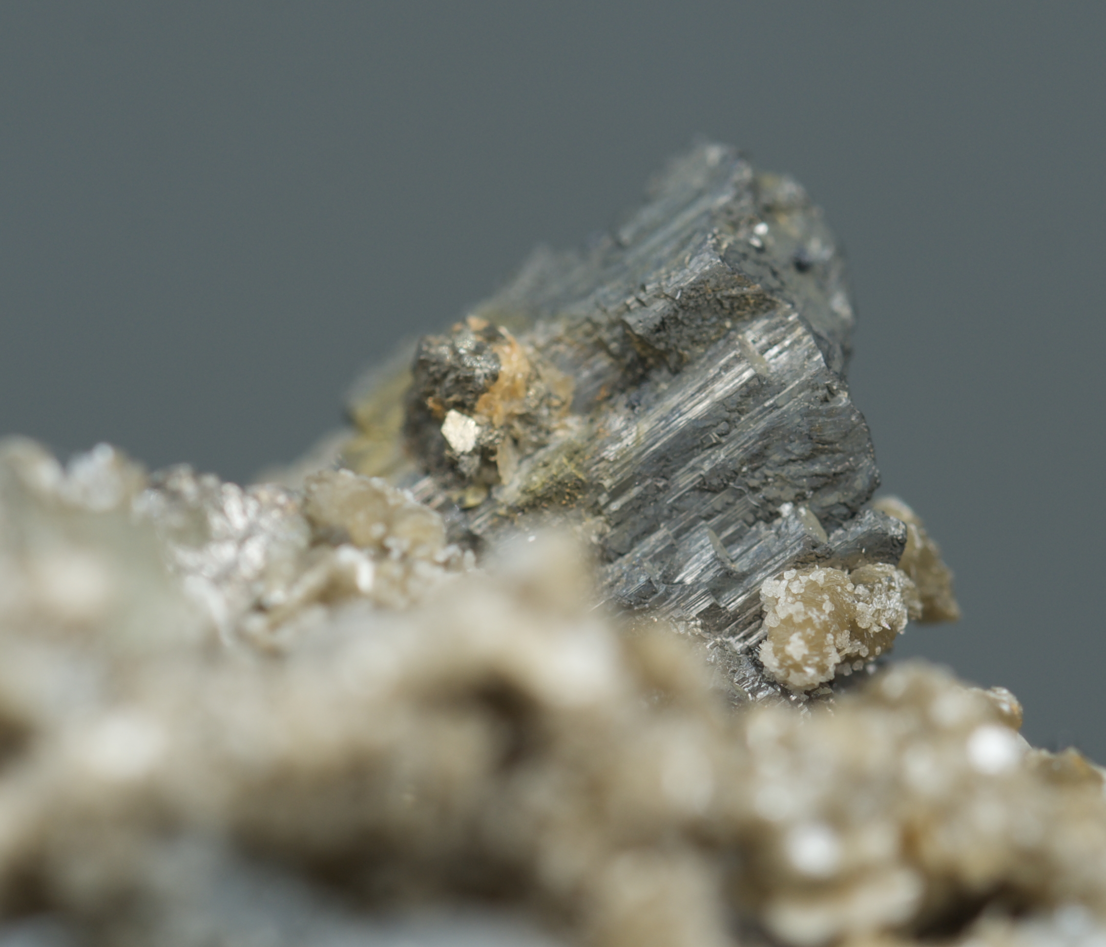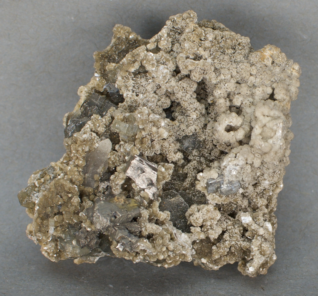 scattered arsenopyrite, minor calcite and minor quartz.