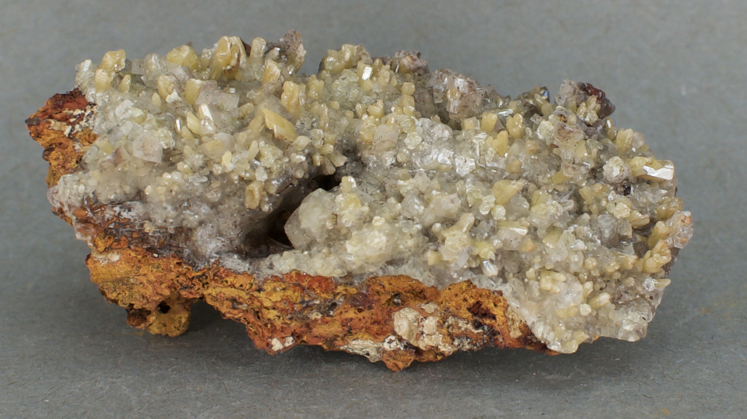 on a limonite matrix, associated with colorless calcite in