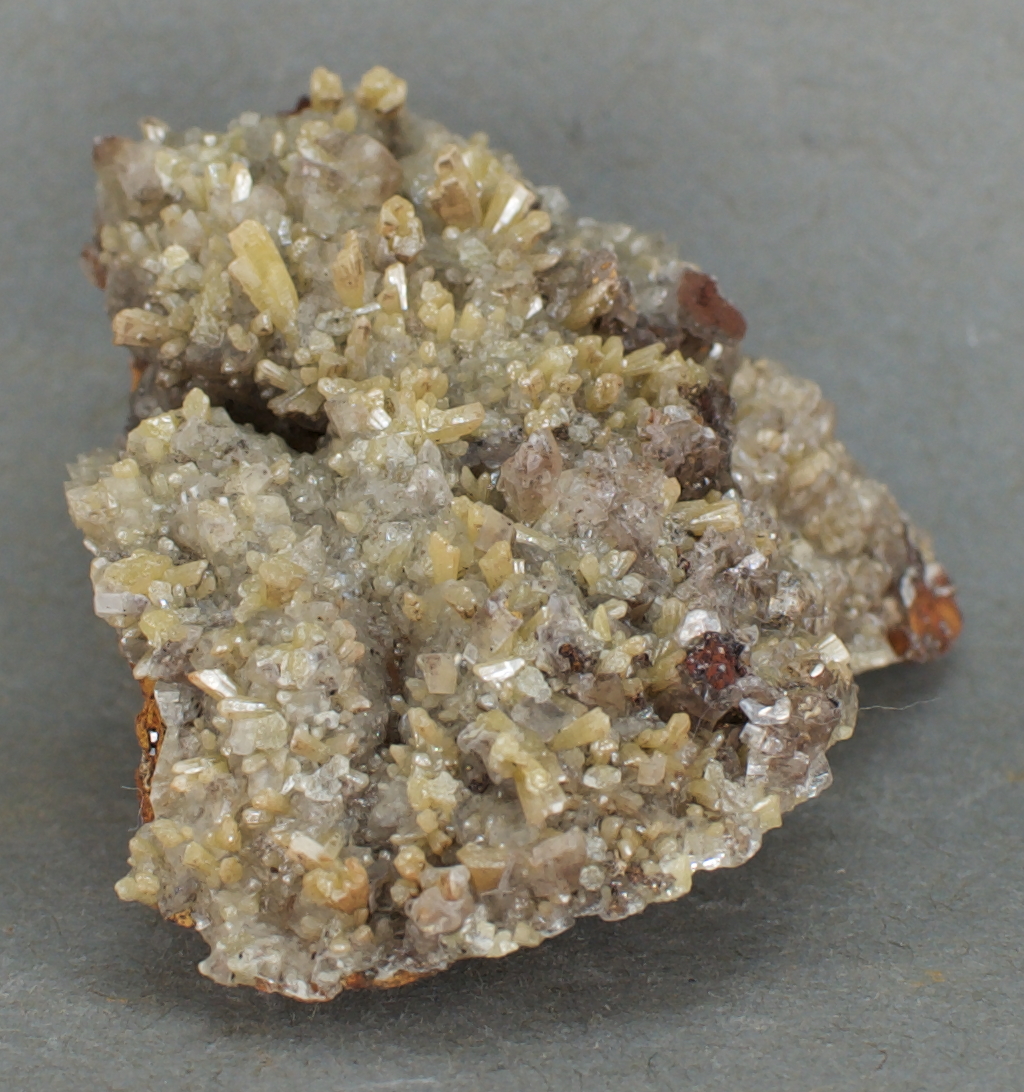 | 32311: Mimetite and Calcite - $16 Santa Eulalia Mining District, Aquiles Serdán Municipality, Chihuahua, Mexico Miniature - 5.6 x 4.5 x 2.8 cm 49 grams Specimen status: Reserved Send an email with specimen number to order Abundant, light yellow mimetite prisms