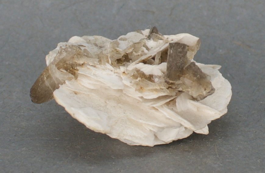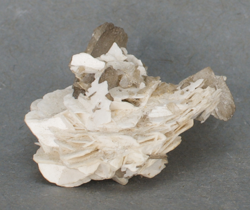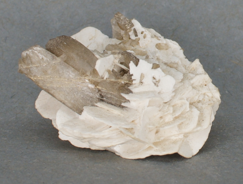 | 02014: Stilbite and Calcite - $24 Himalaya Mine, Gem Hill, Mesa Grande Mining District, San Diego County, California Miniature - 3.3 x 2.7 x 1.8 cm 5.3 grams Fluorescent (SW) Specimen status: Reserved Send an email with specimen number to order Opaque, platy calcite with terminated,