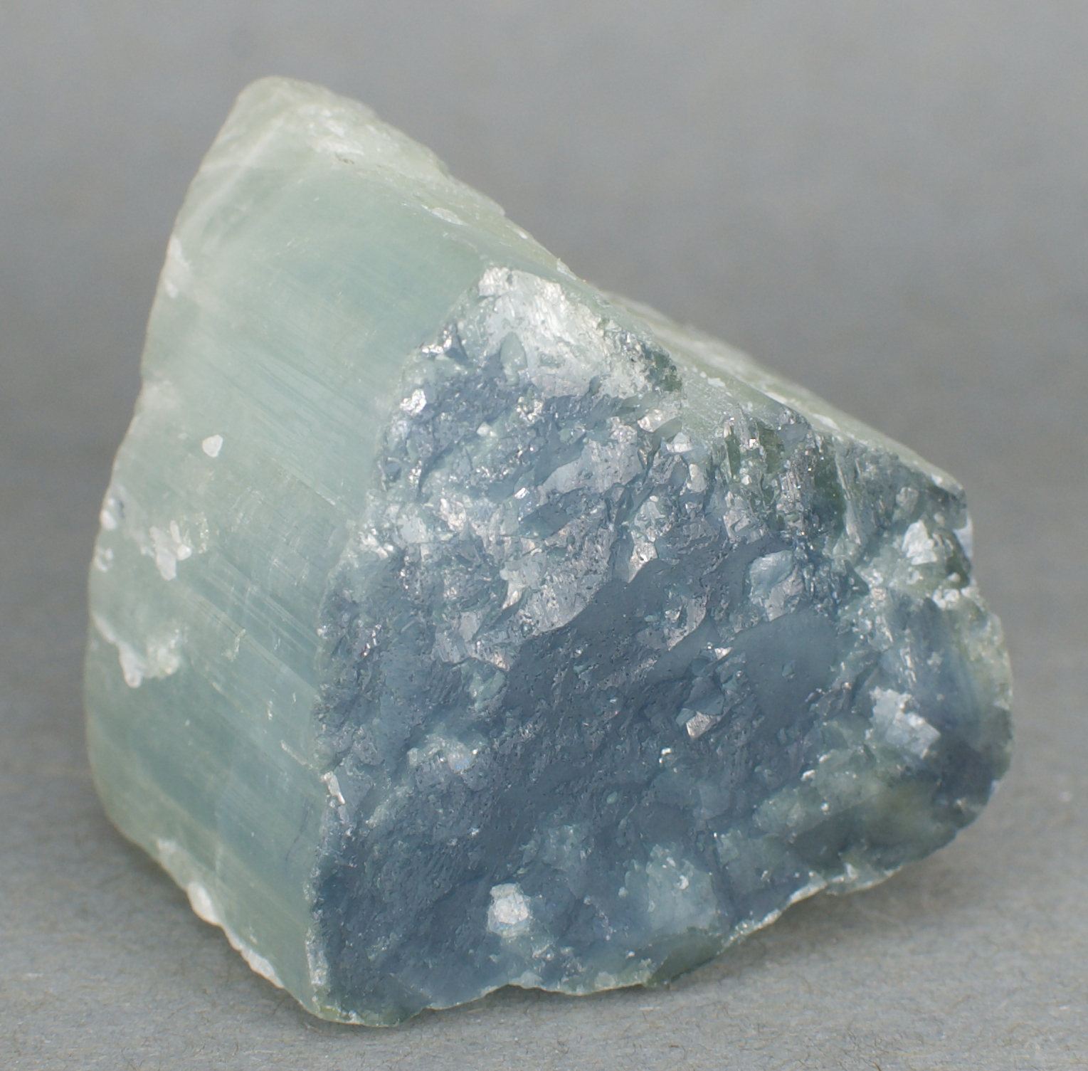 light, translucent minty green with a blue cap,