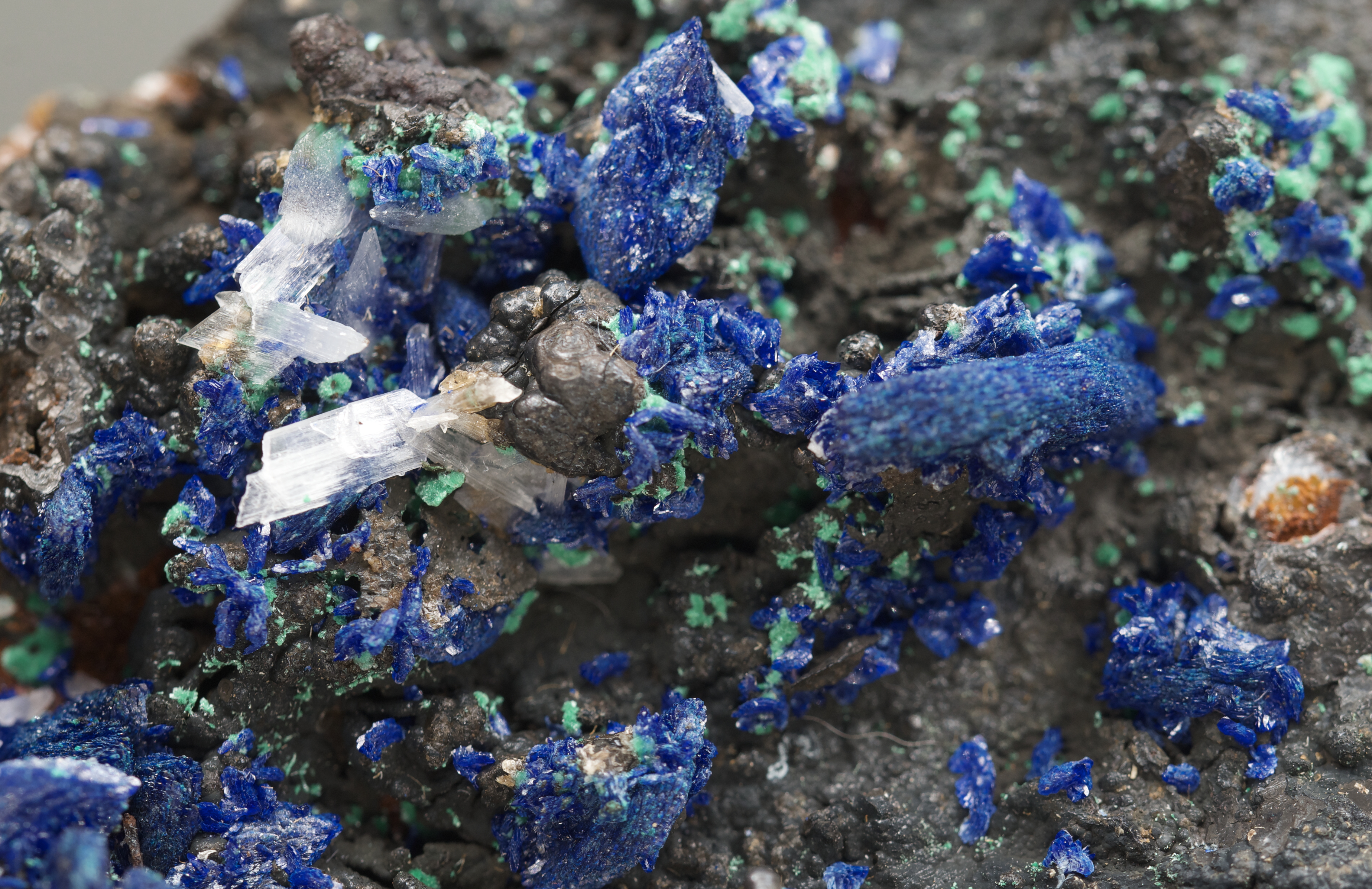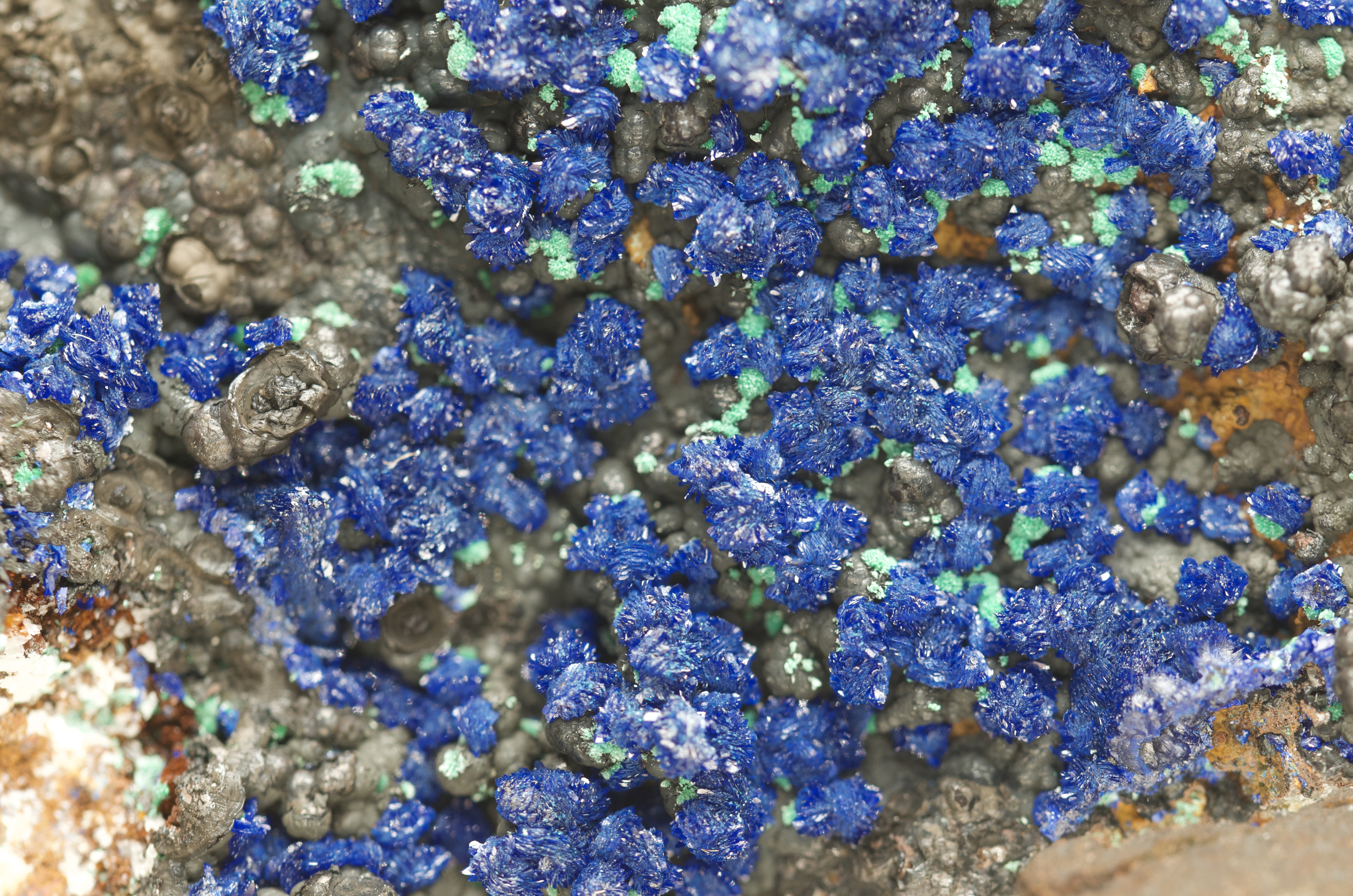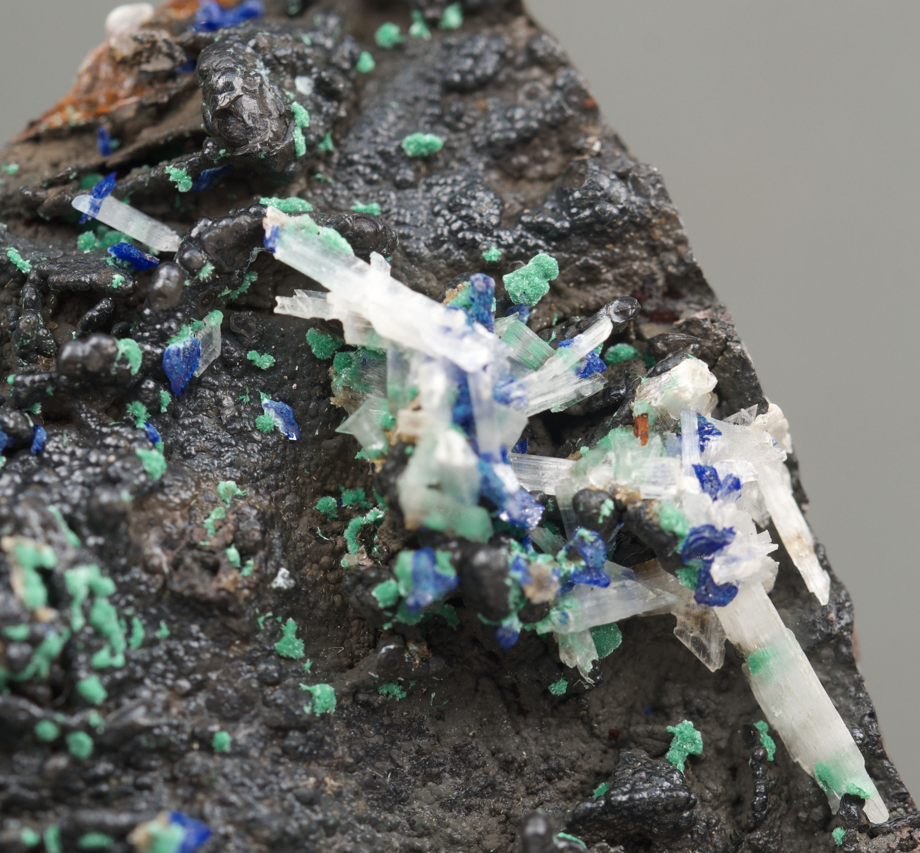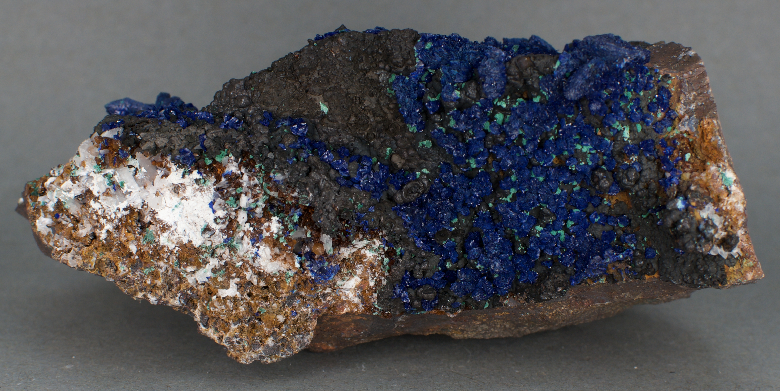 | 09105: Azurite, Malachite and Gypsum - $30 Morenci, Greenlee County, Arizona Cabinet - 9.6 x 9.6 x 4.9 cm 435 grams Specimen status: Reserved Send an email with specimen number to order Two matrix faces are decorated with