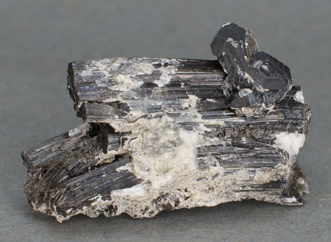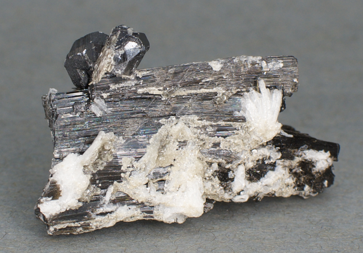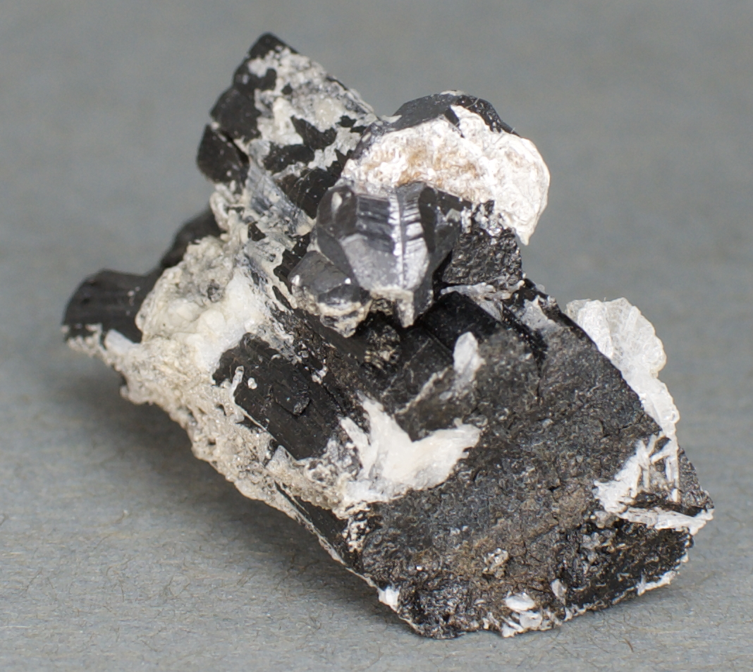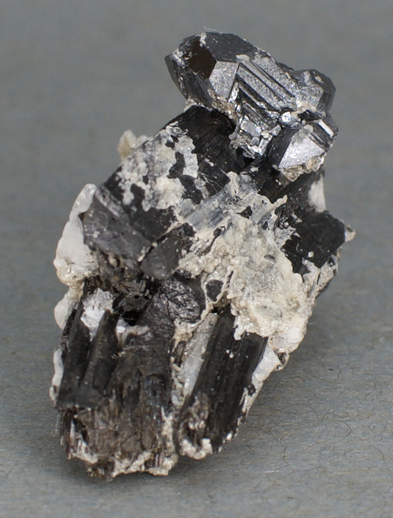 | 11702: Cassiterite and Tourmaline - $38 Haiderabad pegmatites, Shigar Valley, Shigar District, Gilgit-Baltistan, Pakistan Miniature - 3.6 x 2.4 x 1.8 cm 14.5 grams Specimen status: Available Send an email with specimen number to order A lustrous, 1.3 cm cassiterite cluster