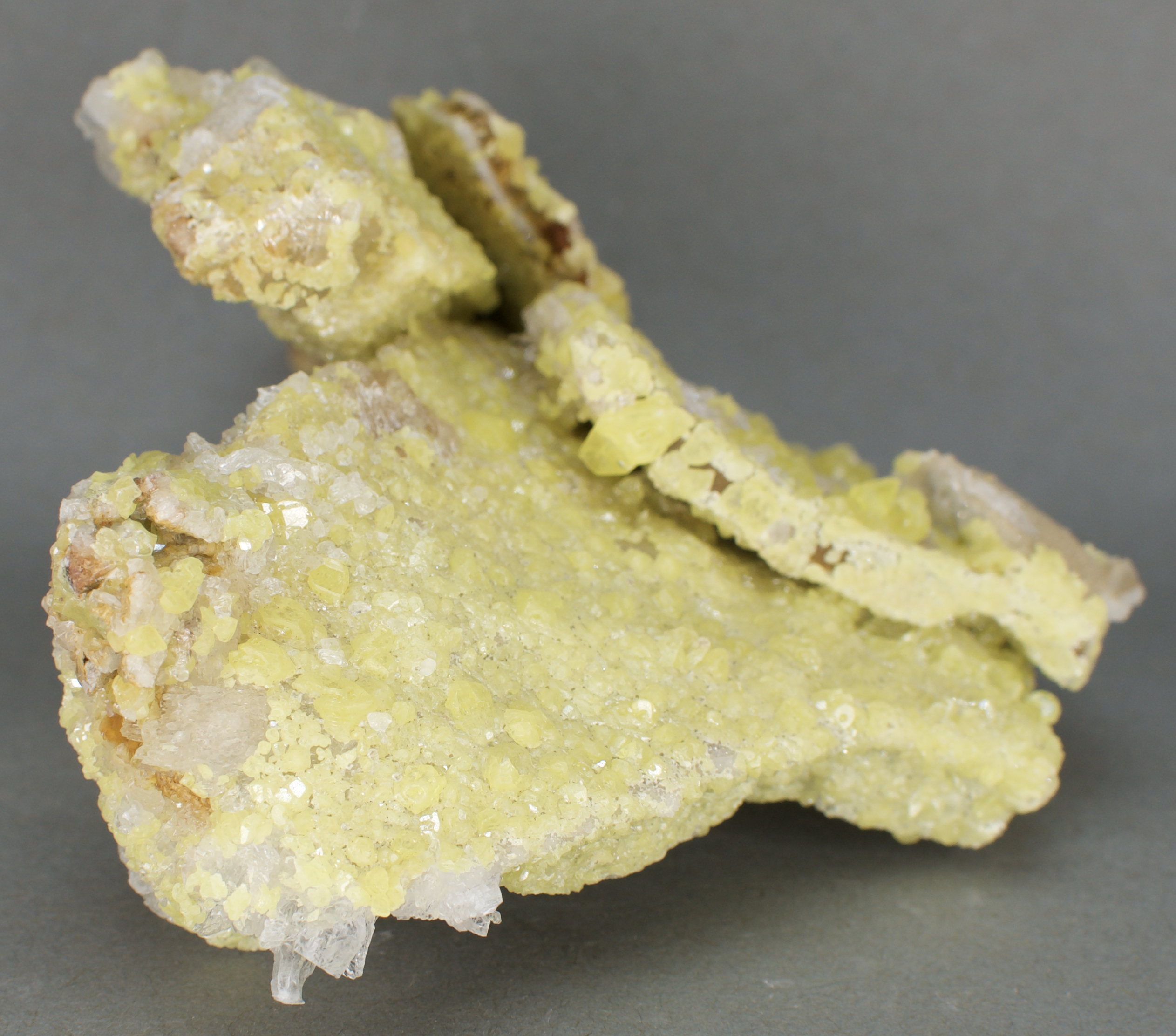 | 12953: Sulfur and Gypsum - $35 Xikuangshan Sb deposit, Lengshuijiang County, Loudi, Hunan, China Cabinet - 13.1 x 10.1 x 3.5 cm 323 grams Specimen status: Reserved Send an email with specimen number to order A curved matrix is coated with