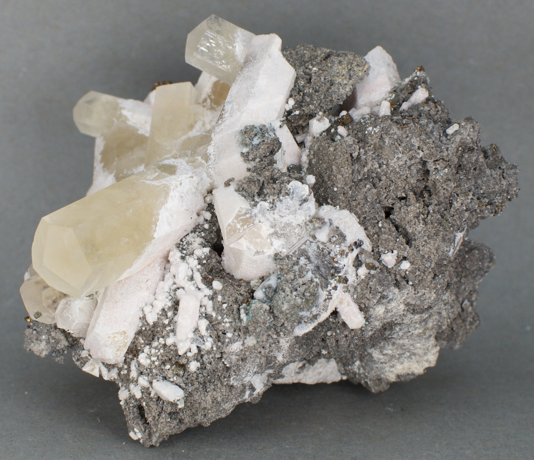 set on the matrix display face. The calcites have a