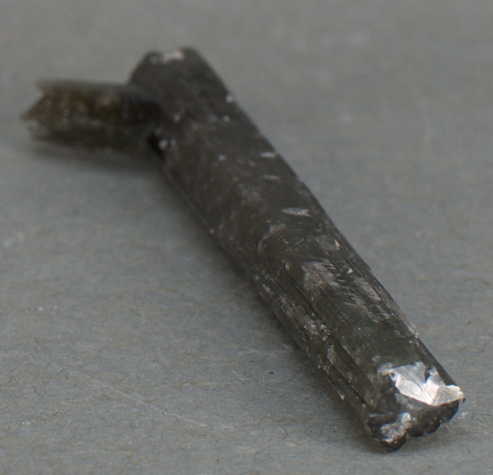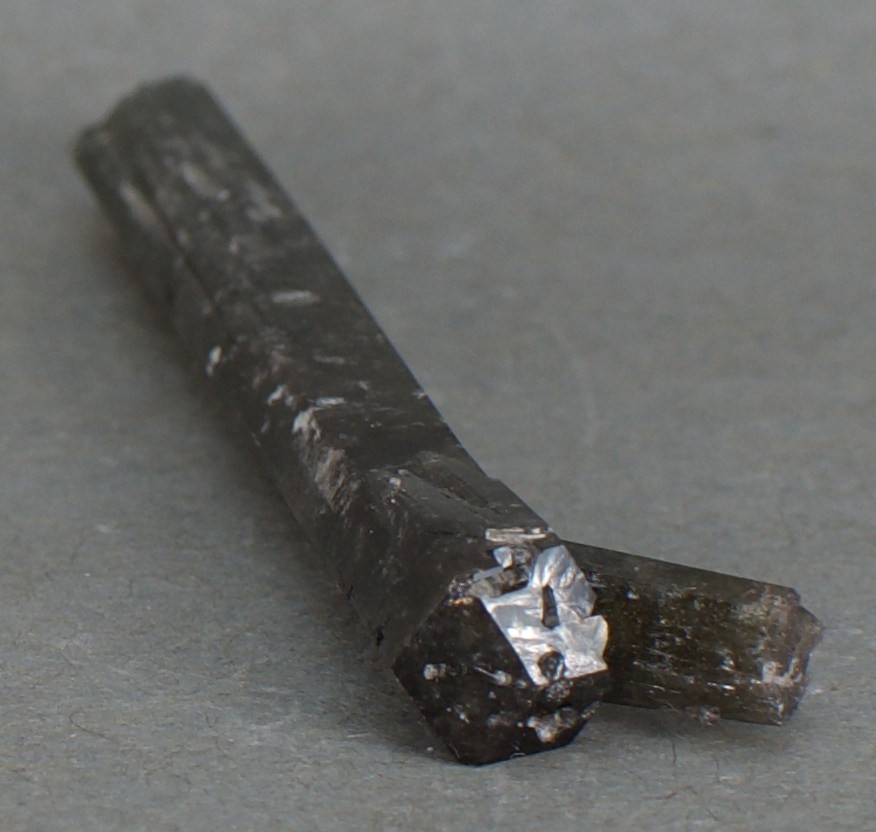 | 03880: Dravite - $40 Brumado, Bahia, Brazil Miniature - 5.9 x 1.7 x 0.8 grams 7.2 grams Specimen status: Available Send an email with specimen number to order A dark green, glass and doubly