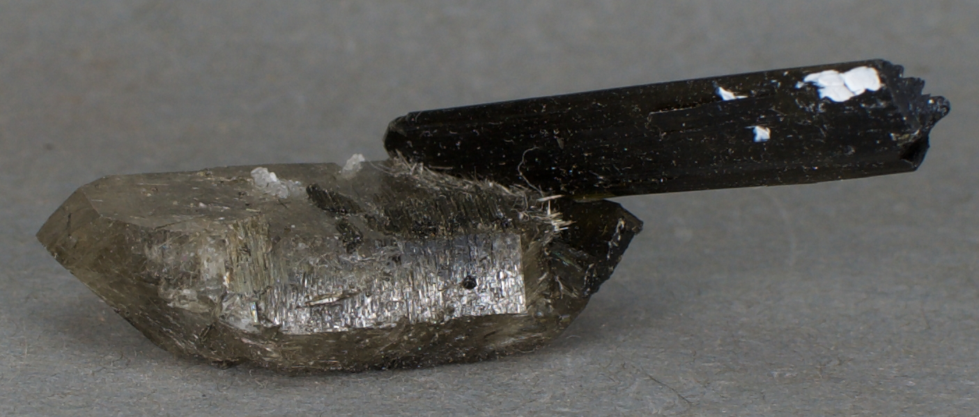 | 05932: Tourmaline and Quartz - $38 Minas Gerais, Brazil Miniature - 5.1 x 3.2 x 2.0 cm 9.3 grams Specimen status: Available Send an email with specimen number to order A glassy, doubly terminated tourmaline
