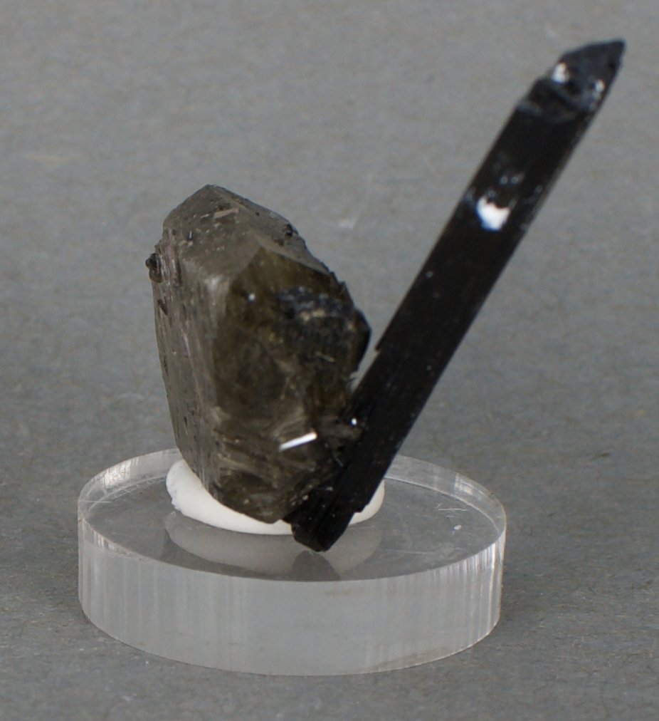 crystal perched on a tabular, lightly smoky quartz crystal