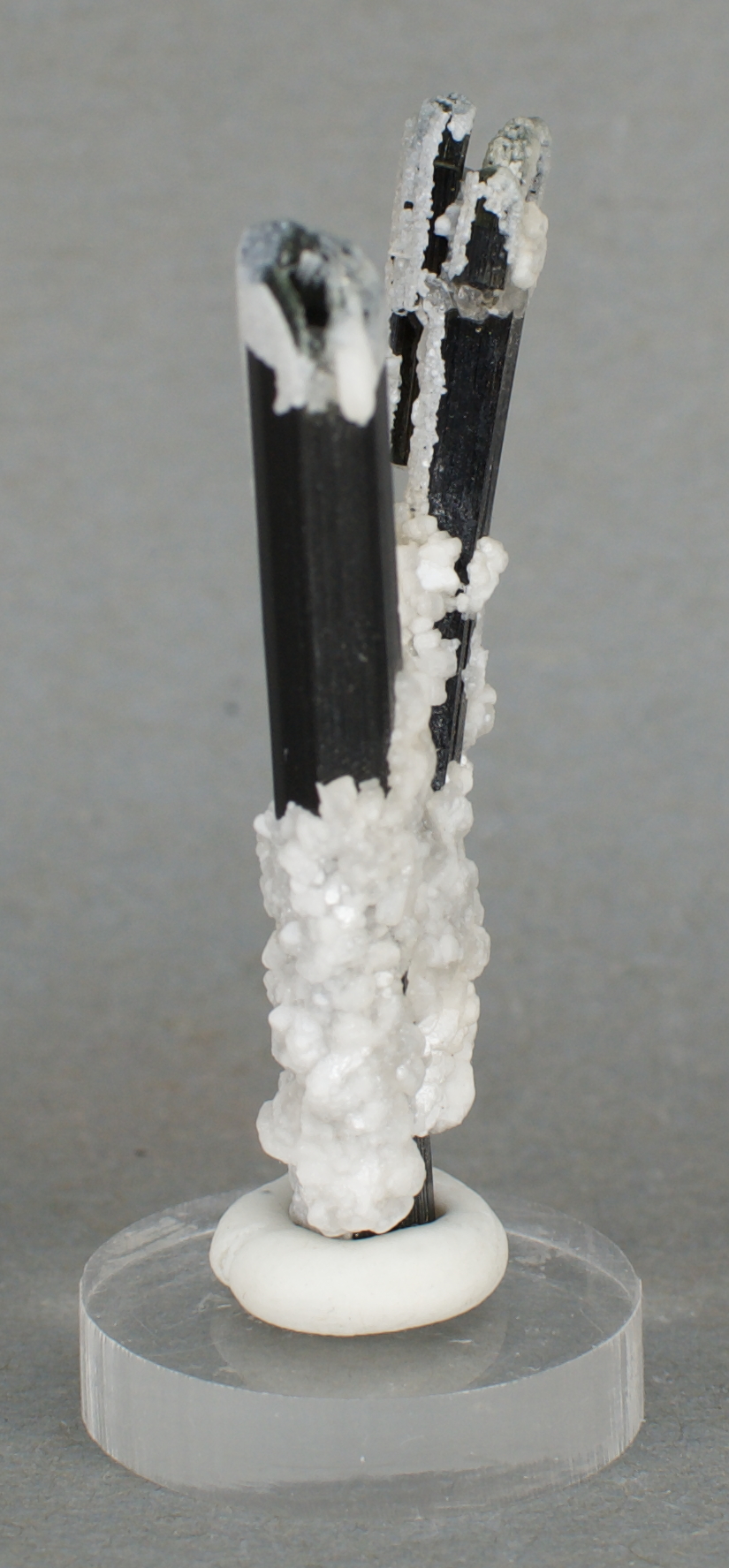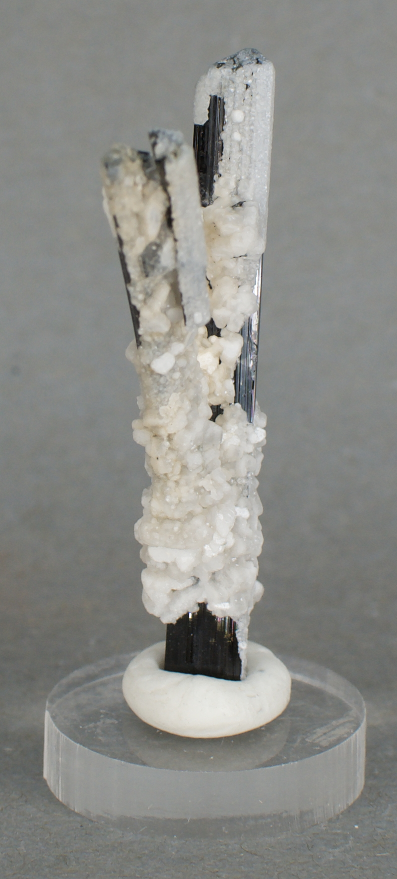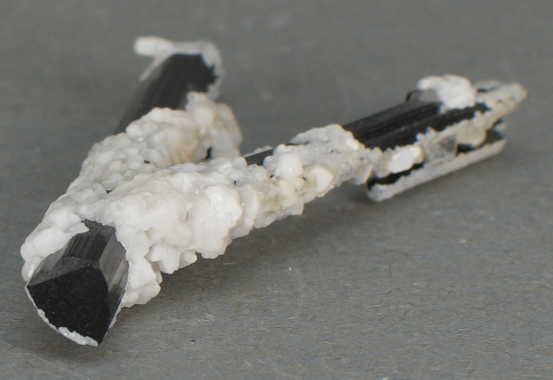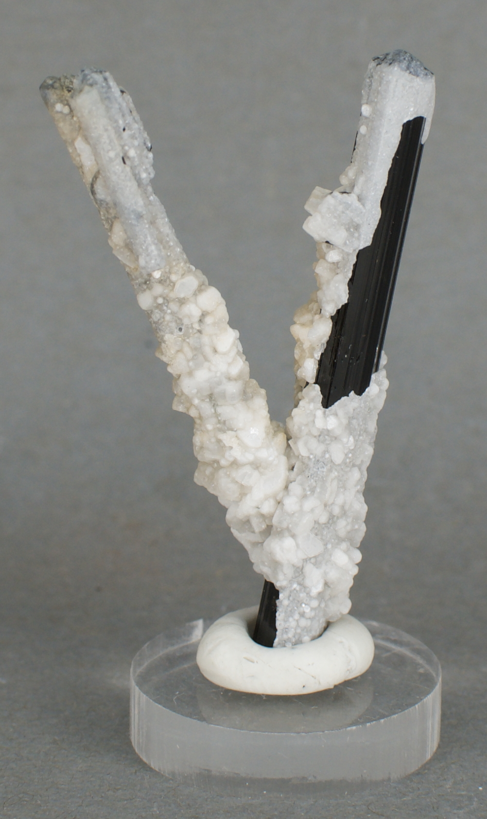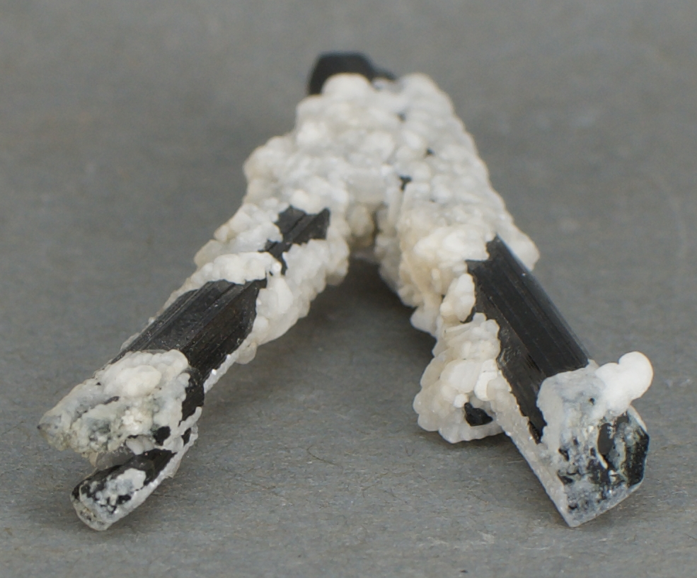 | 07865: Tourmaline and Albite - $40 Chamachhu, Haramosh Mountains, Roundu District, Gilgit-Baltistan, Pakistan Miniature - 5.1 x 3.1 x 0.7 cm 7.4 grams Specimen status: Available Send an email with specimen number to order A V-shaped group of two glassy