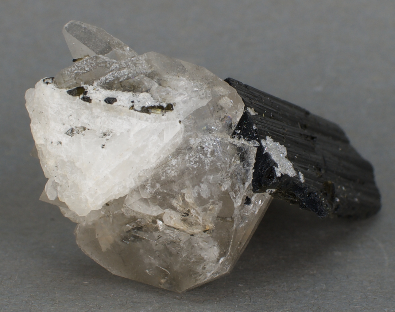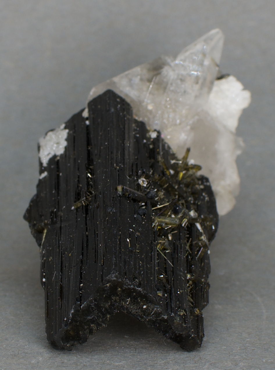 | 09733: Tourmaline and Quartz - $75 Jonas Mine, Conselheiro Pena, Minas Gerais, Brazil Miniature - 5.6 x 3.5 x 3.1 cm 32 grams Specimen status: Available Send an email with specimen number to order Highly unusual! The doubly-terminated,