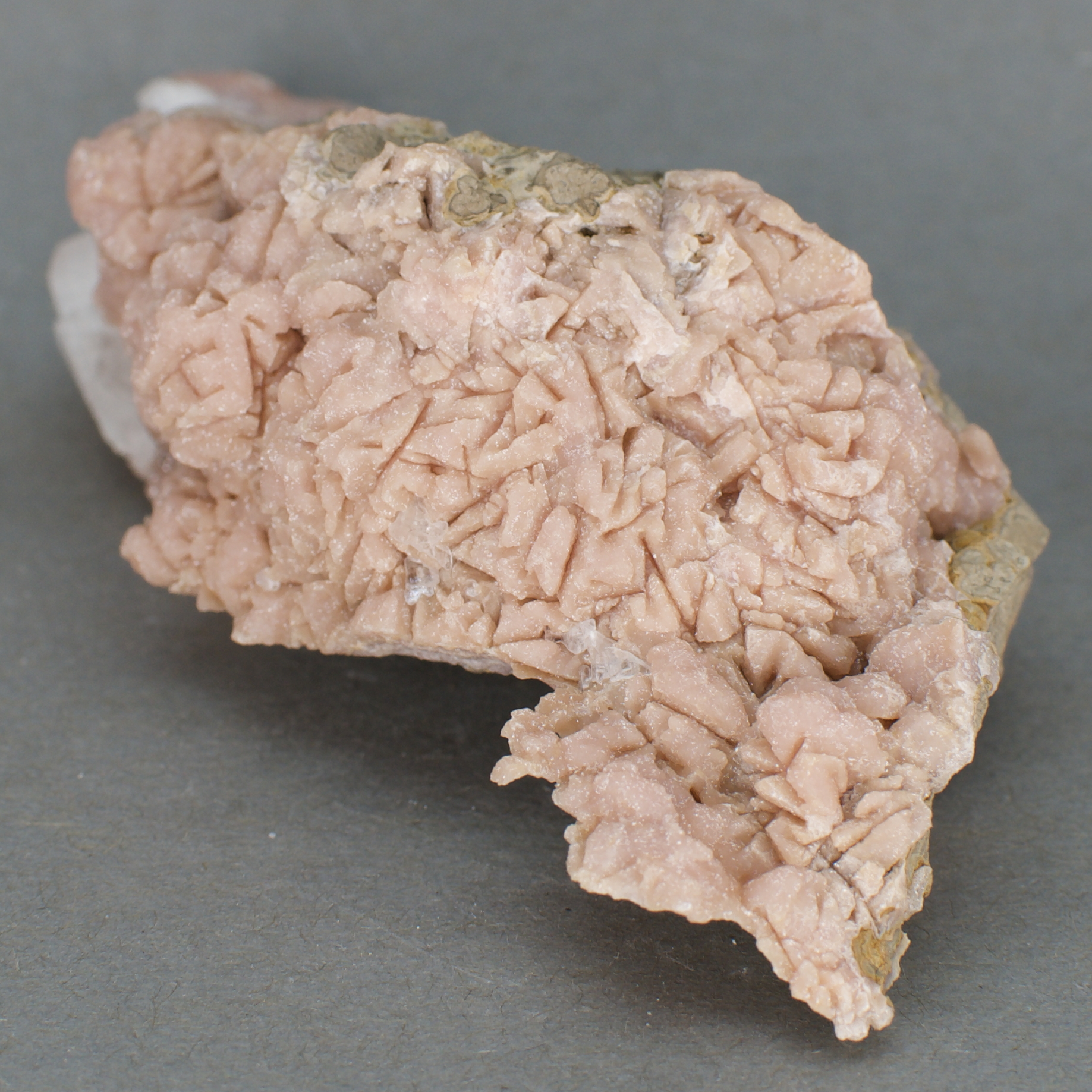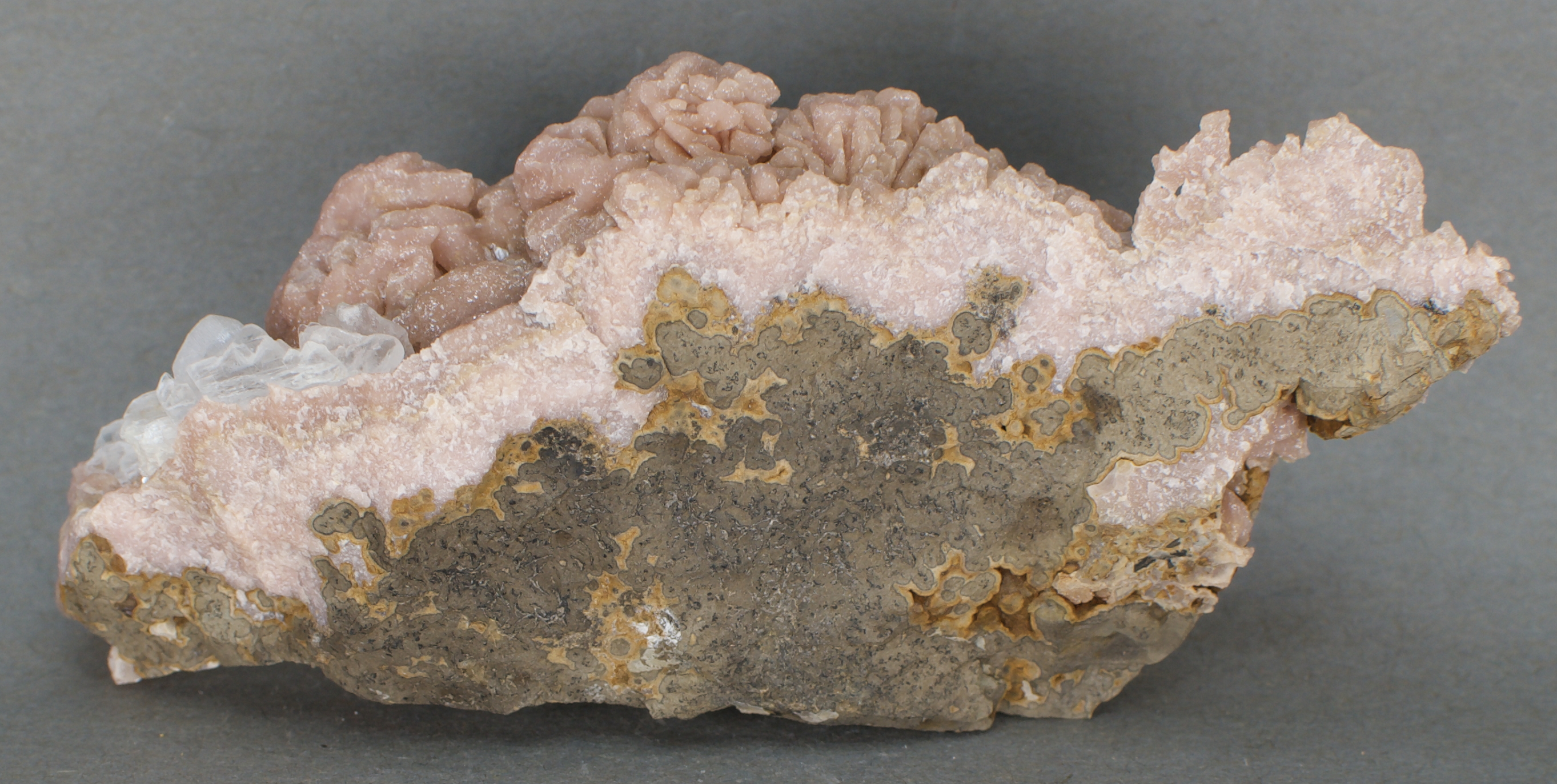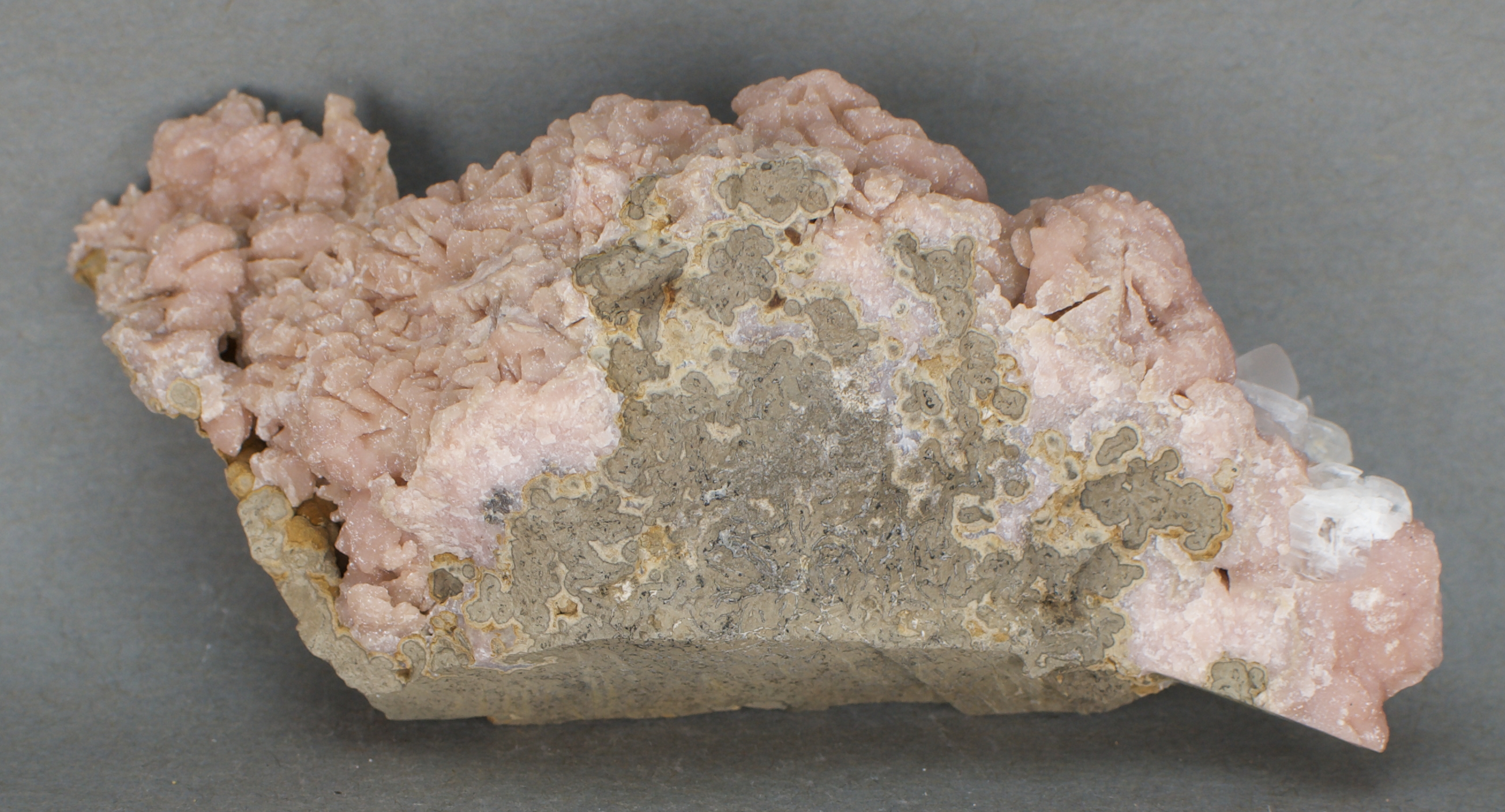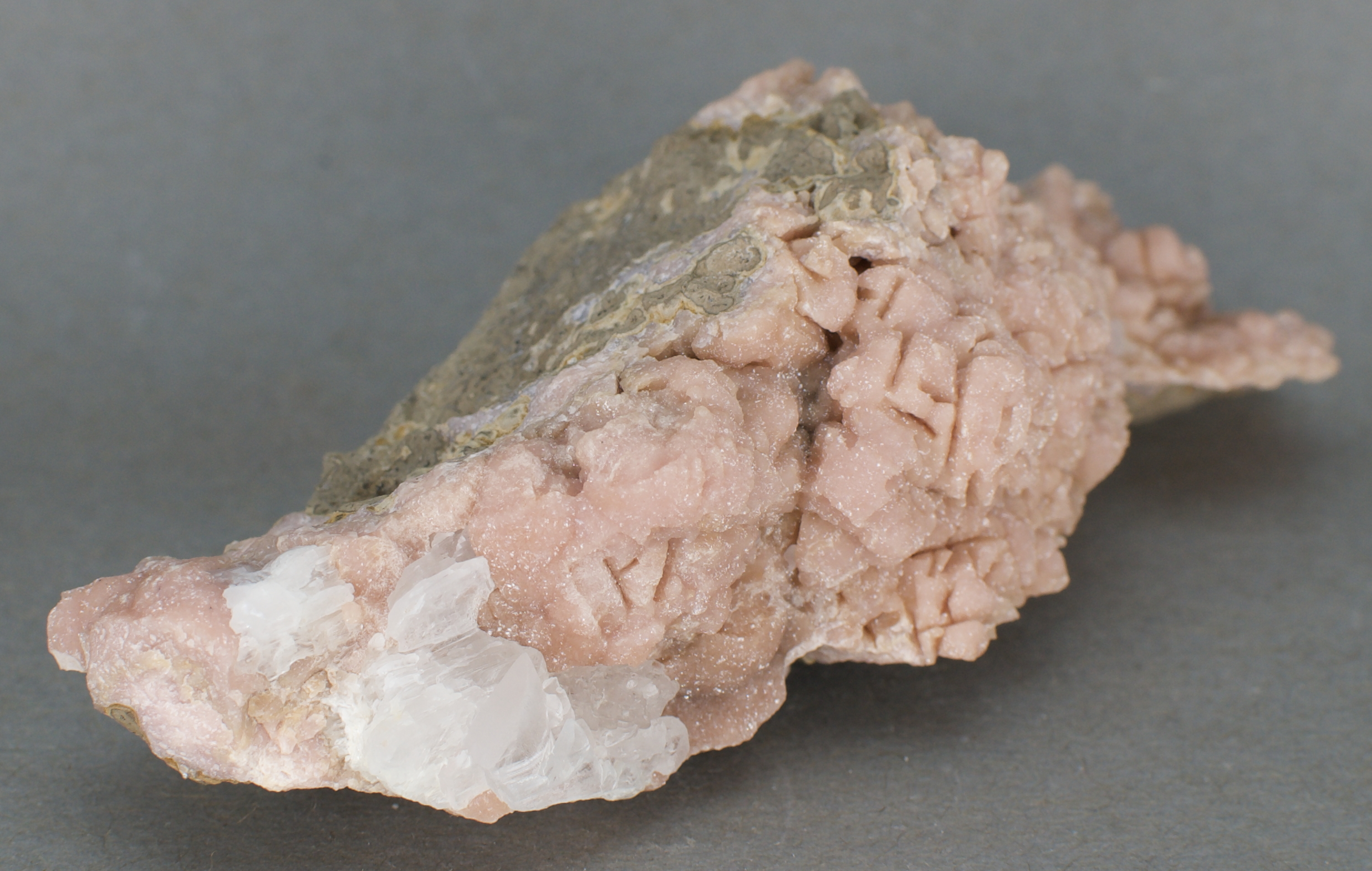 | 11733: Rhodochrosite and Gypsum - $40 Potosà Mine, Francisco Portillo, West Camp, Santa Eulalia Mining District, Aquiles Serdán Municipality, Chihuahua, Mexico Cabinet - 11.1 x 4.6 x 3.2 cm 176 grams Specimen status: Available Send an email with specimen number to order Abundant, light pink rhodochrosite