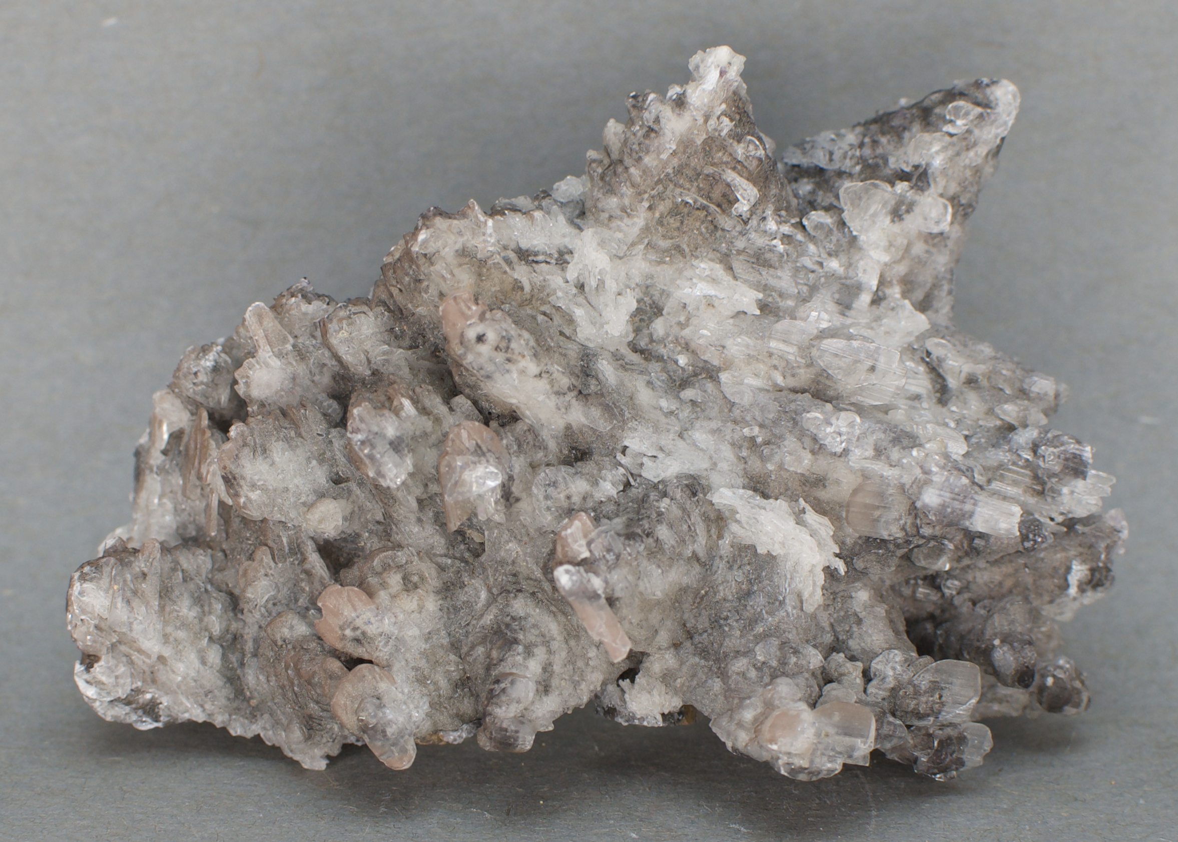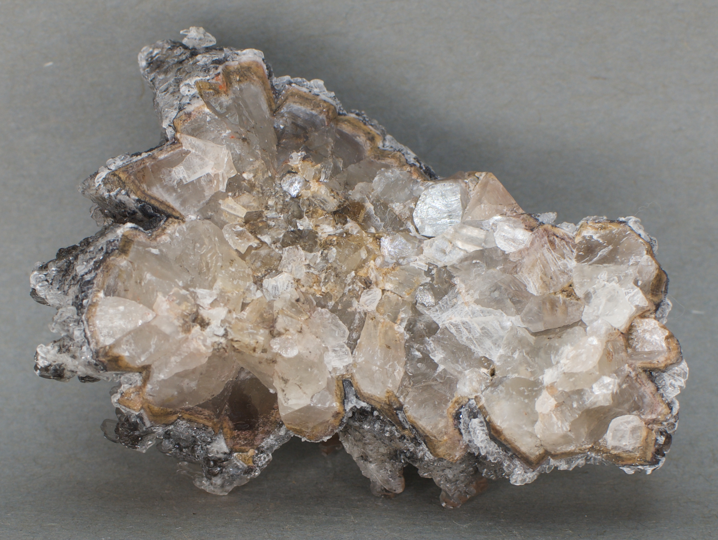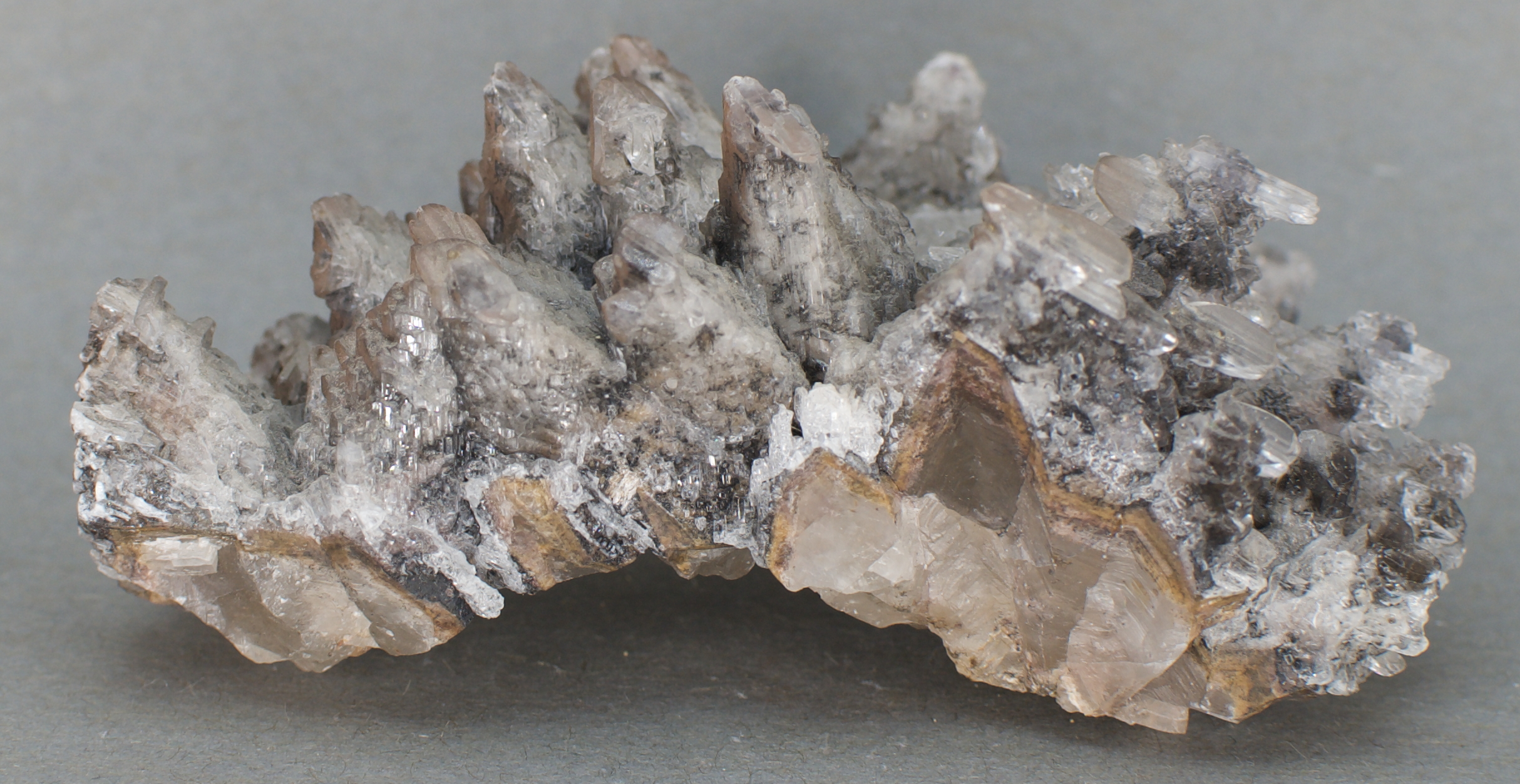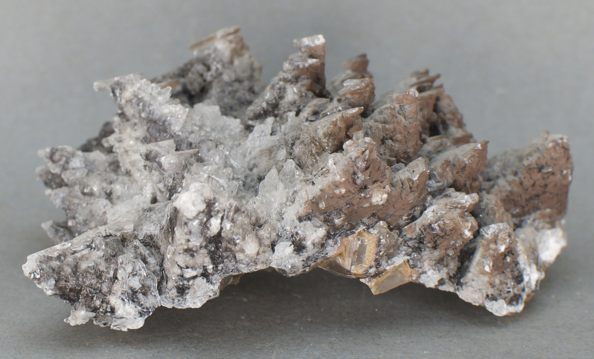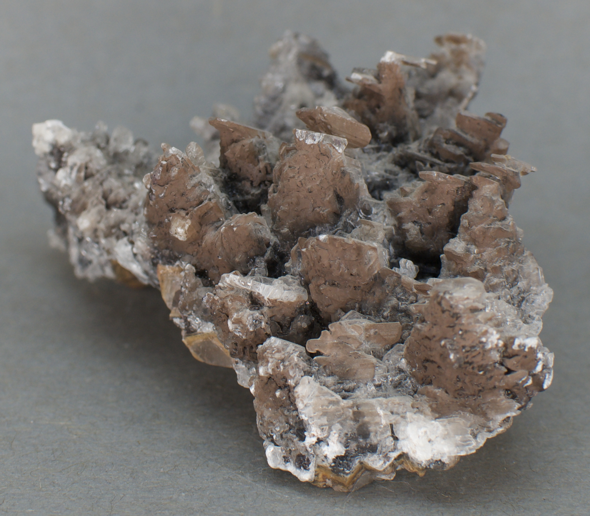 to brown calcite scalenohedral ('dogtooth') crystals, with
