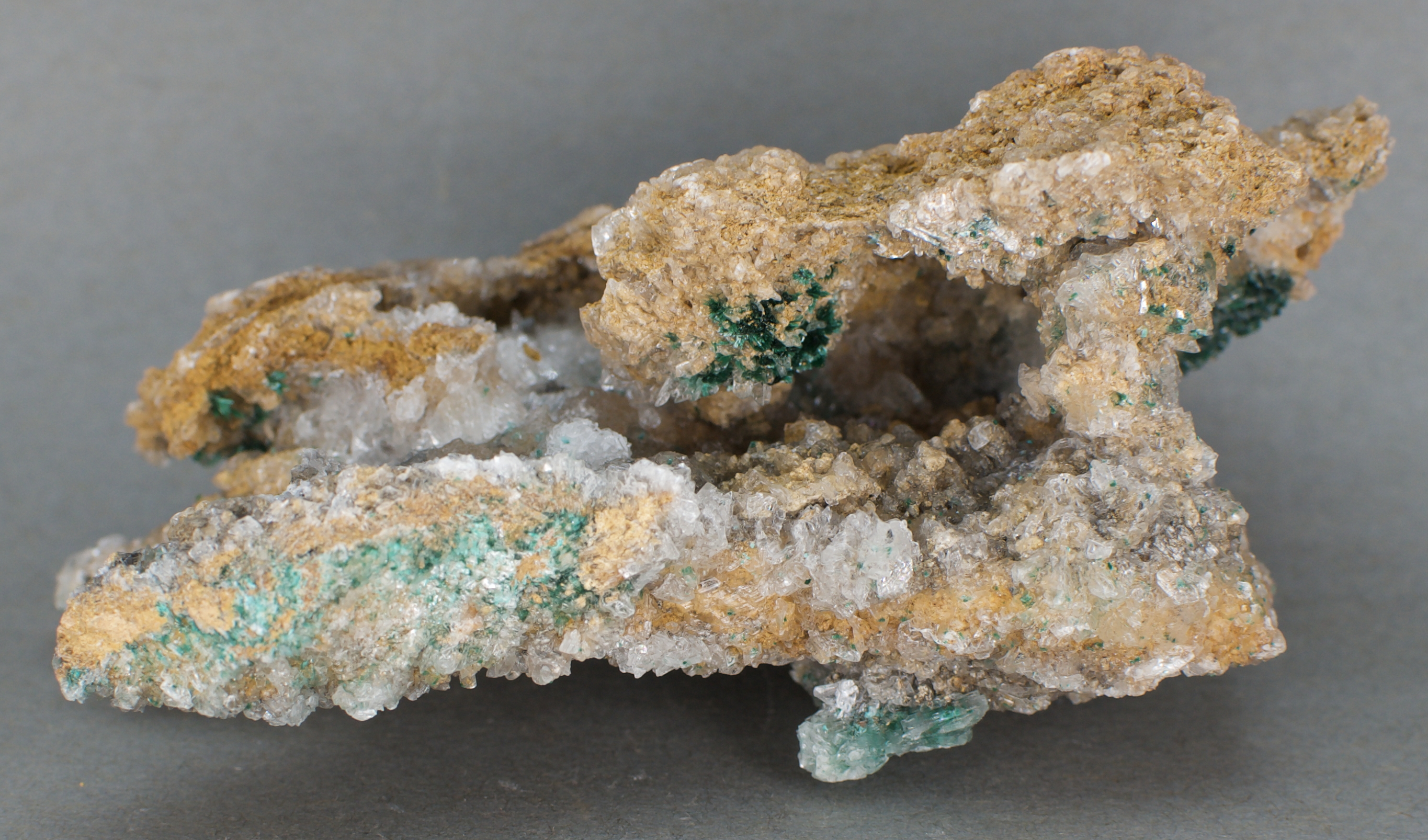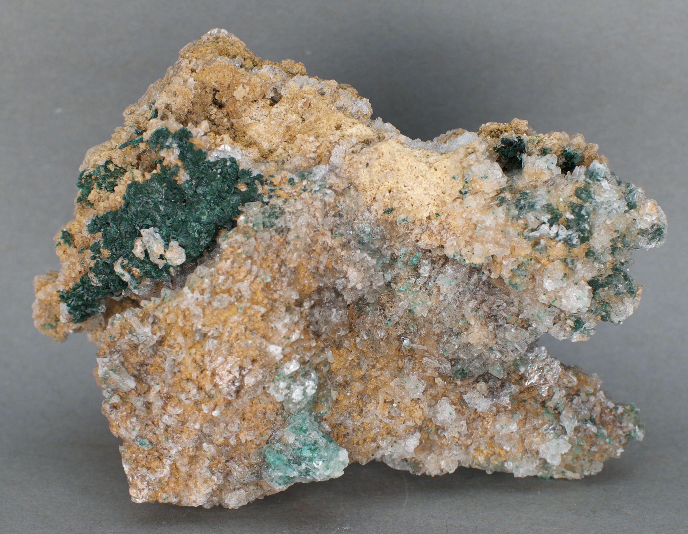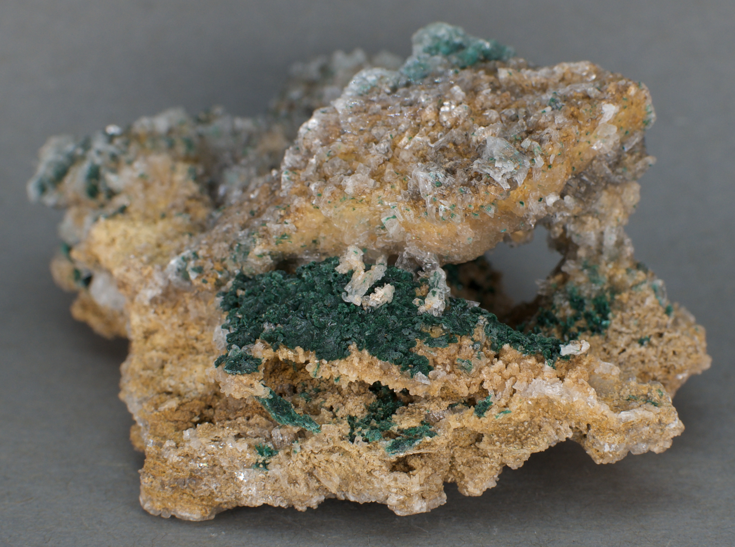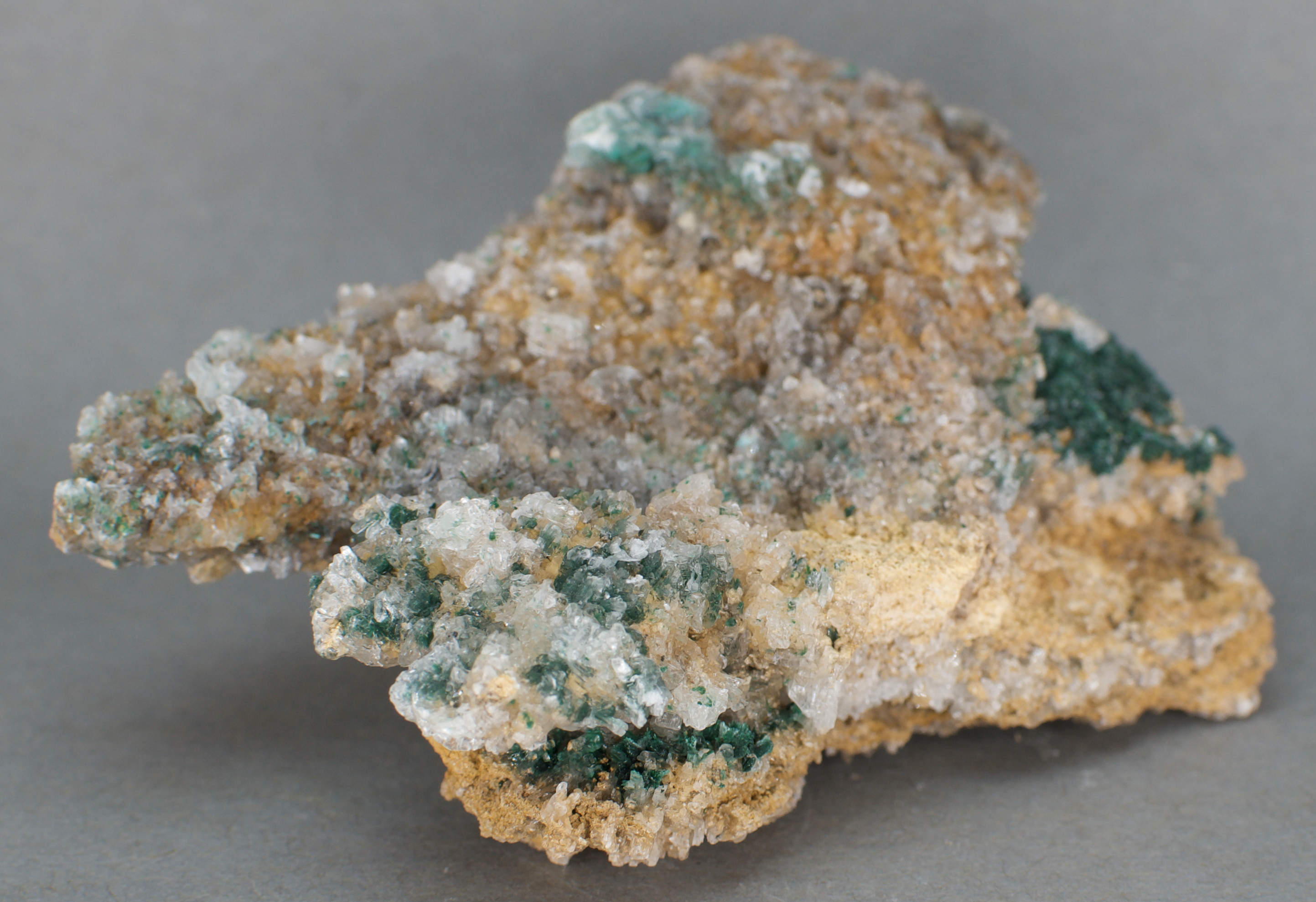 Selenite - $20 Pcheloyad Mine, Pcheloyad, Krumovgrad Municipality, Kardzhali Province, Bulgaria Cabinet - 10.7 x 7.6 x 4.9 cm 198 grams Specimen status: Reserved Send an email with specimen number to order Crusty patches of dark green malachite