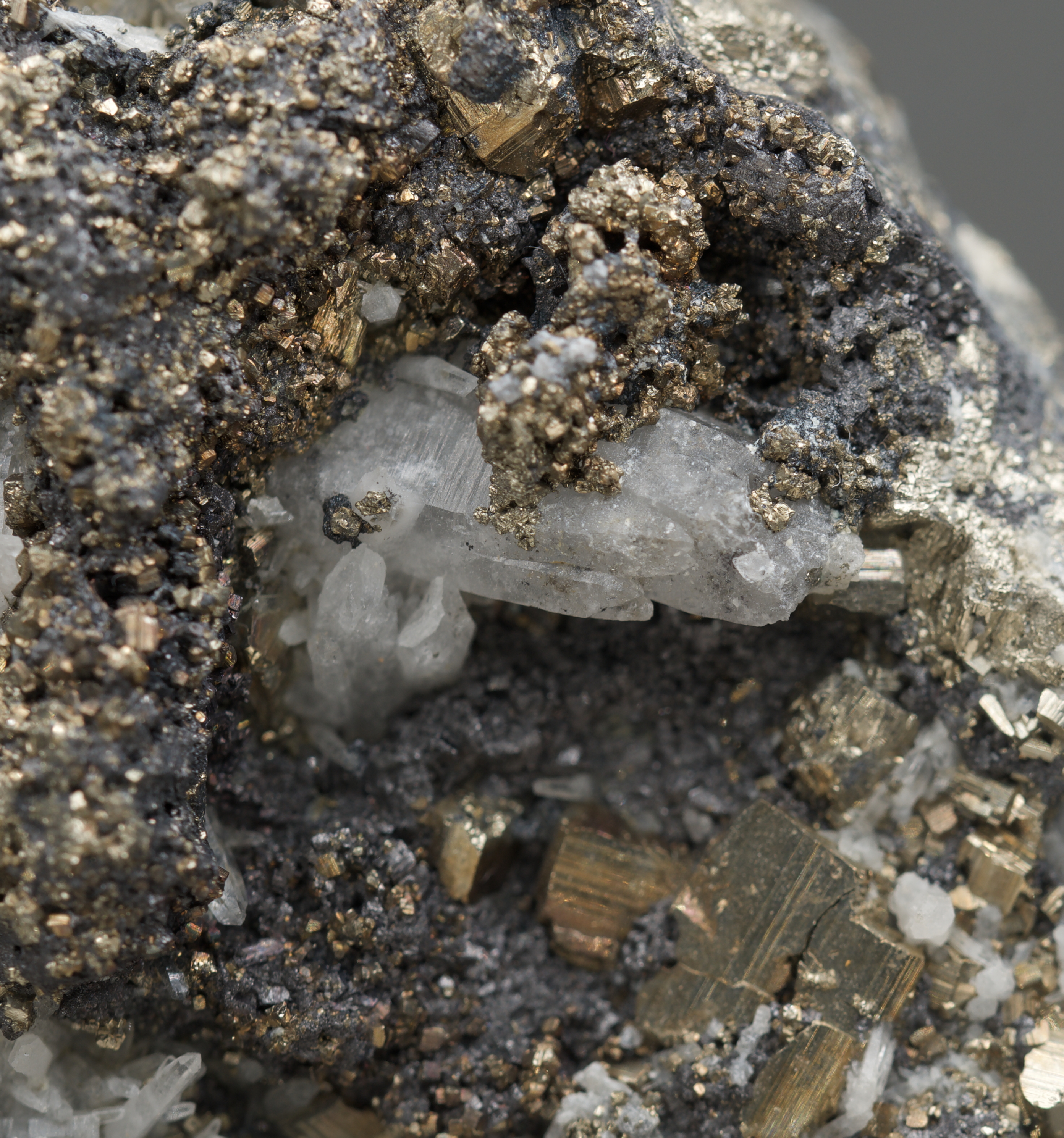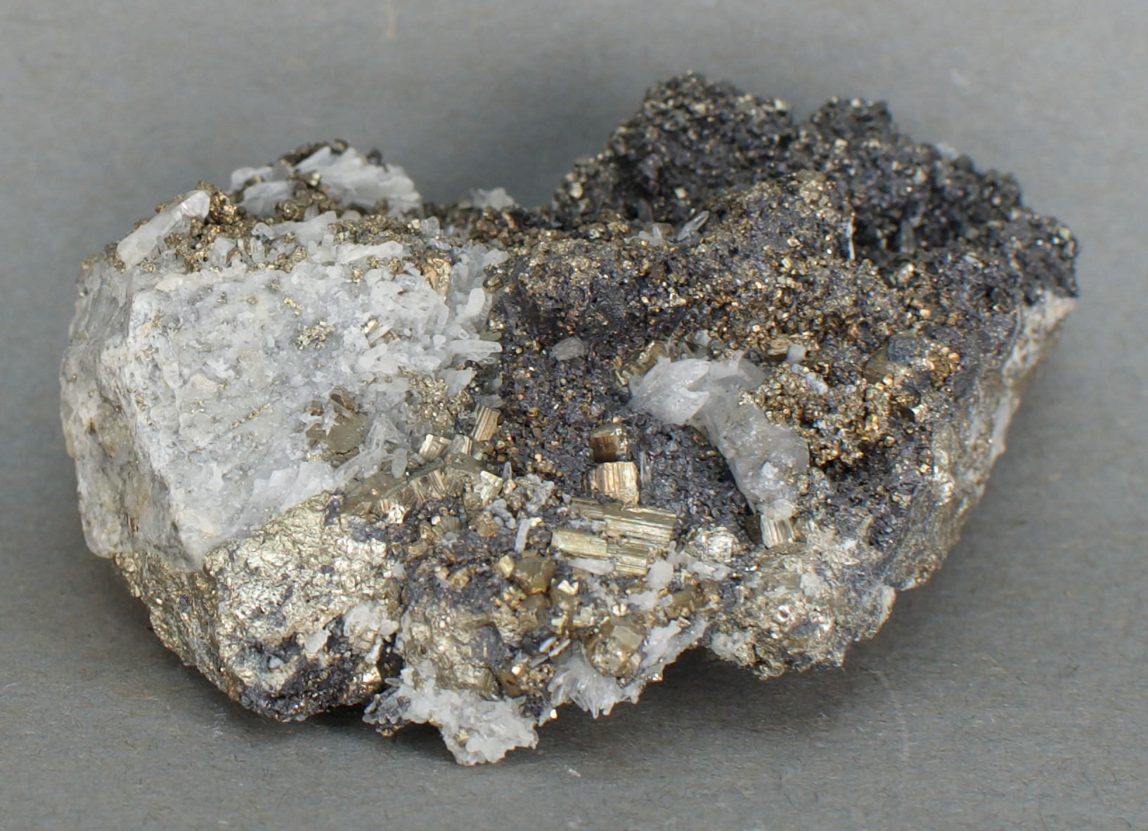 striated pyrite crystals with dark, microcrystalline