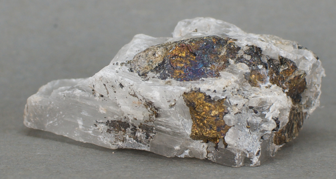 Selenite - $12 New Cornelia Mine, Ajo, Little Ajo Mountains, Ajo Mining District, Pima County, Arizona Miniature - 5.1 x 4.0 x 1.9 cm 34 grams Specimen status: Available Send an email with specimen number to order Massive, iridescent chalcopyrite